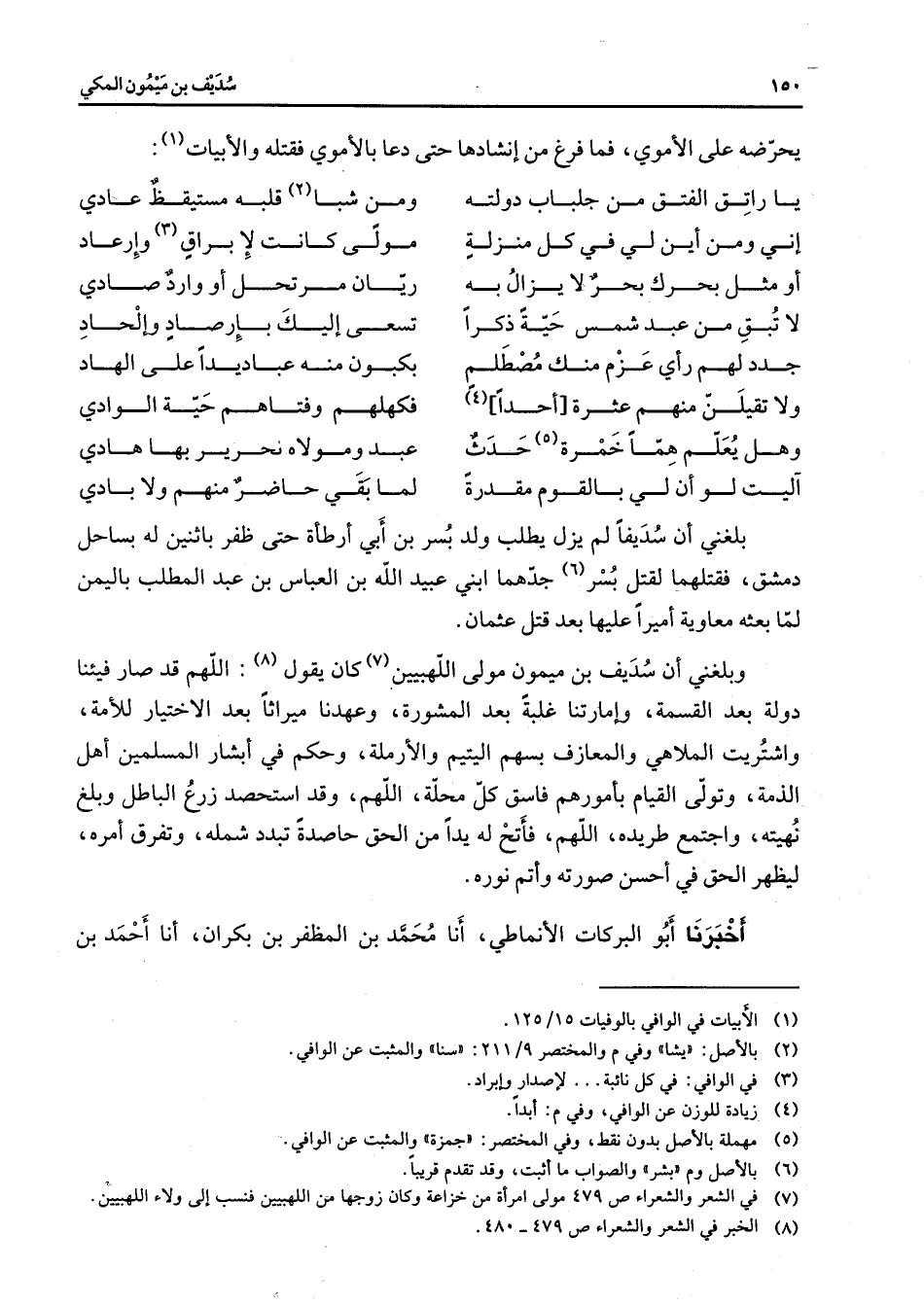 يحرضه على الأموي فما فرغ من إنشادها حتى دعا بالأموي فقتله والأبيات (1) يا راتق الفتق من جلباب دولته * ومن شبا (2) قلبه مستيقظ عادي إني ومن أين لي في كل منزلة * مولى كانت لإبراق (3) وإرعاد أو مثل بحرك بحر لا يزال به * ريان مرتحل أو وارد صادي لا تبق من عبد شمس حية ذكرا * تسعى إليك بإرصاد وإلحاد جدد لهم رأي عزم منك مصطلم * بكبون منه عباديدا على الهاد ولا تقيلن منهم عثرة أحدا (4) * فكهلهم وفتاهم حية الوادي * * وهل يعلم هما خمرة (5) حدث * عبد ومولاه تحرير بها هادي آليت لو أن لي بالقوم مقدرة * لما بقي حاضر منهم ولا بادي * بلغني أن سديفا لم يزل يطلب ولد بسر بن أبي أرطأة حتى ظفر باثنين له بساحل دمشق فقتلهما لقتل بسر (6) جدهما ابني عبيد الله بن العباس بن عبد المطلب باليمن لما بعثه معاوية أميرا عليها بعد قتل عثمان وبلغني أن سديف بن ميمون مولى اللهبيين (7) كان يقول (8) اللهم قد صار فيئنا دولة بعد القسمة وإمارتنا غلبة بعد المشورة وعهدنا ميراثا بعد الاختيار للأمة واشتريت الملاهي والمعازف بسهم اليتيم والأرملة وحكم في أبشار المسلمين أهل الذمة وتولى القيام بأمورهم فاسق كل محلة اللهم وقد استحصد زرع الباطل وبلغ نهيته واجتمع طريده اللهم فأتح له يدا من الحق حاصدة تبدد شمله وتفرق أمره ليظهر الحق في أحسن صورته وأتم نوره أخبرنا أبو البركات الأنماطي أنا محمد بن المظفر بن بكران أنا أحمد بن