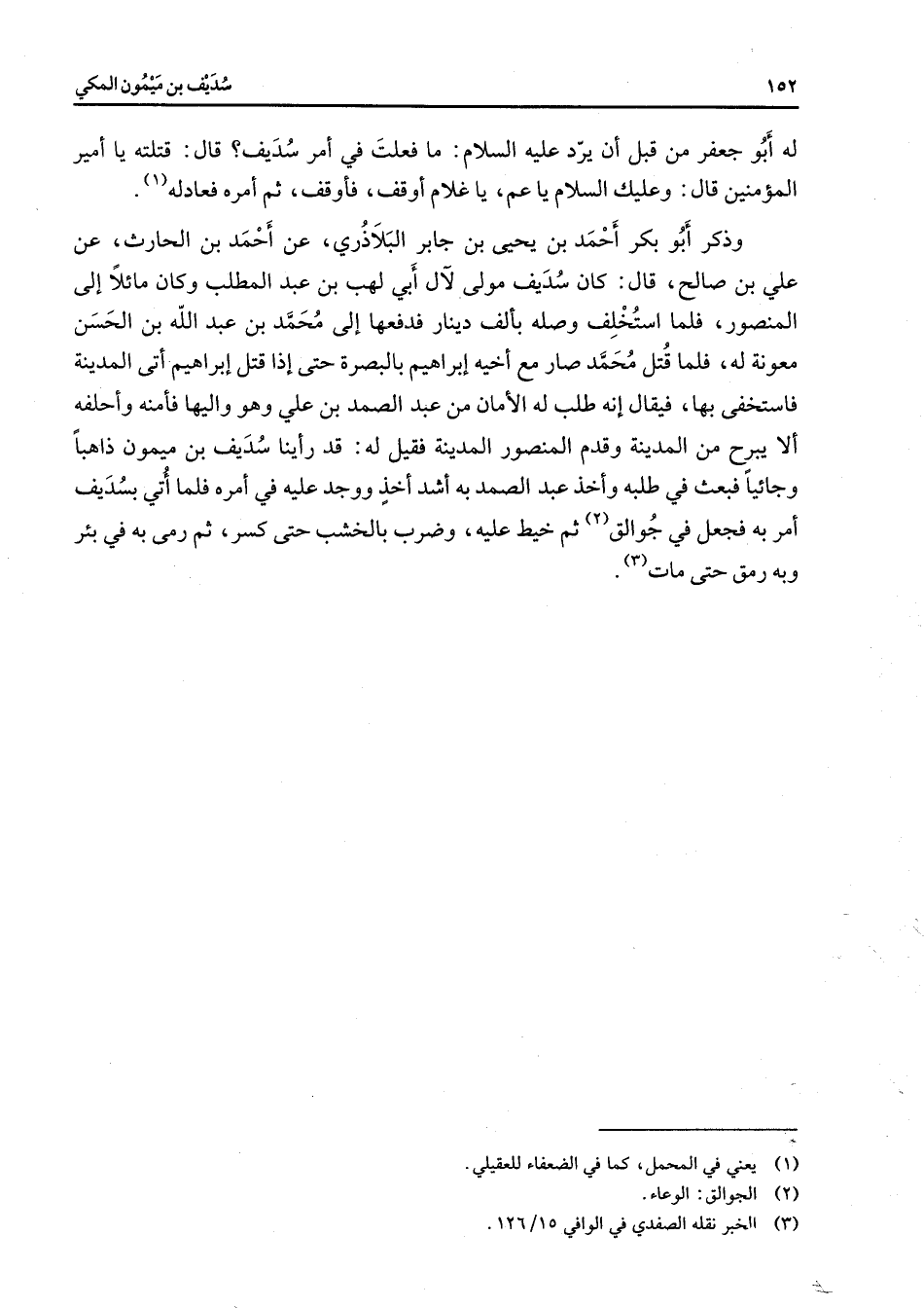 له أبو جعفر من قبل أن يرد عليه السلام ما فعلت في أمر سديف قال قتلته يا أمير المؤمنين قال وعليك السلام يا عم يا غلام أوقف فأوقف ثم أمره فعادله (1) وذكر أبو بكر أحمد بن يحيى بن جابر البلاذري عن أحمد بن الحارث عن علي بن صالح قال كان سديف مولى لآل أبي لهب بن عبد المطلب وكان مائلا إلى المنصور فلما استخلف وصله بألف دينار فدفعها إلى محمد بن عبد الله بن الحسن معونة له فلما قتل محمد صار مع أخيه إبراهيم بالبصرة حتى إذا قتل إبراهيم أتى المدينة فاستخفى بها فيقال إنه طلب له الأمان من عبد الصمد بن علي وهو واليها فأمنه وأحلفه ألا يبرح من المدينة وقدم المنصور المدينة فقيل له قد رأينا سديف بن ميمون ذاهبا وجائيا فبعث في طلبه وأخذ عبد الصمد به أشد أخذ ووجد عليه في أمره فلما أتي بسديف أمر به فجعل في جوالق (2) ثم خيط عليه وضرب بالخشب حتى كسر ثم رمى به في بئر وبه رمق حتى مات (3)