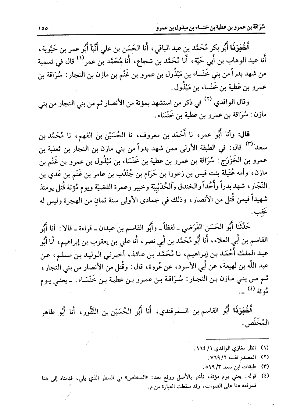 أخبرنا أبو بكر محمد بن عبد الباقي أنا الحسن بن علي أنبأ أبو عمر بن حيوية أنا عبد الوهاب بن أبي حية أنا محمد بن شجاع أنا محمد بن عمر (1) قال في تسمية من شهد بدرا من بني خنساء بن مبذول بن عمرو بن غنم بن مازن بن النجار سراقة بن عمرو بن عطية بن خنساء بن مبذول وقال الواقدي (2) في ذكر من استشهد بمؤتة من الأنصار ثم من بني النجار من بني مازن سراقة بن عمرو بن عطية بن خنساء قال وأنا أبو عمر نا أحمد بن معروف نا الحسين بن الفهم نا محمد بن سعد (3) قال في الطبقة الأولى ممن شهد بدرا من بني مازن بن النجار بن ثعلبة بن عمرو بن الخزرج سراقة بن عمرو بن عطية بن خنساء بن مبذول بن عمرو بن غنم بن مازن وأمه عتيلة بنت قيس بن زعورا بن حرام بن جندب بن عامر بن غنم بن عدي بن النجار شهد بدرا وأحدا والخندق والحديبية وخيبر وعمرة القضية ويوم مؤتة قتل يومئذ شهيدا فيمن قتل من الأنصار وذلك في جمادى الأولى سنة ثمان من الهجرة وليس له عقب حدثنا أبو الحسن الفرضي لفظا وأبو القاسم بن عبدان قراءة قالا أنا أبو القاسم بن أبي العلاء أنا أبو محمد بن أبي نصر أنا علي بن يعقوب بن إبراهيم أنا أبو عبد الملك أحمد بن إبراهيم نا محمد بن عائذ أخبرني الوليد بن مسلم عن عبد الله بن لهيعة عن أبي الأسود عن عروة قال وقتل من الأنصار من بني النجار ثم من بني مازن بن النجار سراقة بن عمرو بن عطية بن خنساء يعني يوم مؤتة (4) أخبرنا أبو القاسم بن السمرقندي أنا أبو الحسين بن النقور أنا أبو طاهر المخلص