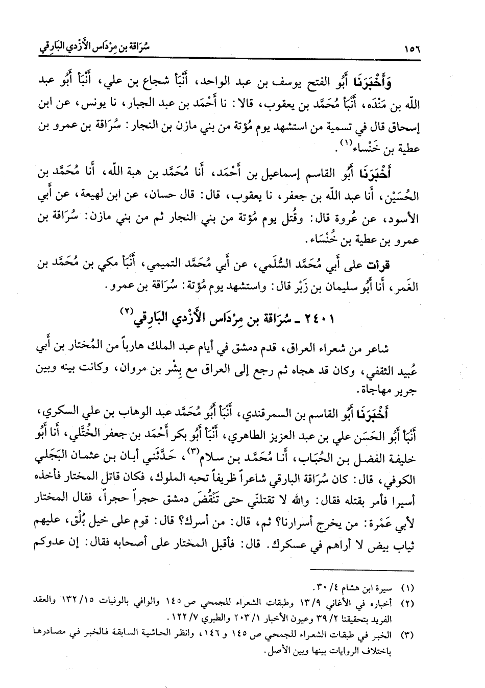 2401 - سراقة بن مرداس الأزدي البارقي (2) شاعر من شعراء العراق قدم دمشق في أيام عبد الملك هاربا من المختار بن أبي عبيد الثقفي وكان قد هجاه ثم رجع إلى العراق مع بشر بن مروان وكانت بينه وبين جرير مهاجاة أخبرنا أبو القاسم بن السمرقندي أنبأ أبو محمد عبد الوهاب بن علي السكري أنبأ أبو الحسن علي بن عبد العزيز الطاهري أنبأ أبو بكر أحمد بن جعفر الختلي أنا أبو خليفة الفضل بن الحباب أنا محمد بن سلام (3) حدثني أبان بن عثمان البجلي الكوفي قال كان سراقة البارقي شاعرا ظريفا تحبه الملوك فكان قاتل المختار فأخذه أسيرا فأمر بقتله فقال والله لا تقتلني حتى تنقض دمشق حجرا حجرا فقال المختار لأبي عمرة من يخرج أسرارنا ثم قال من أسرك قال قوم على خيل بلق عليهم ثياب بيض لا أراهم في عسكرك قال فأقبل المختار على أصحابه فقال إن عدوكم