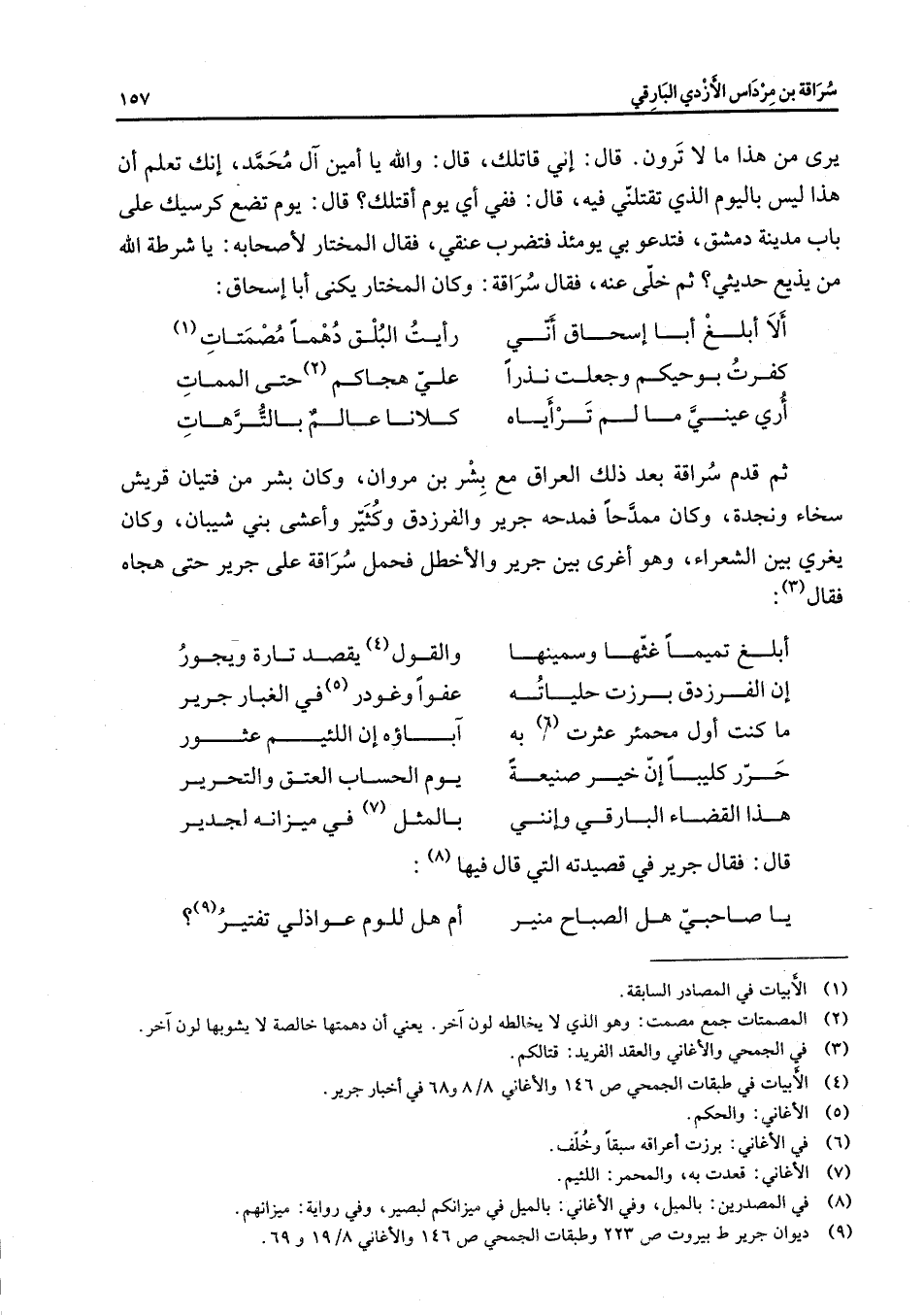 يرى من هذا ما لا ترون قال إني قاتلك قال والله يا أمين آل محمد إنك تعلم أن هذا ليس باليوم الذي تقتلني فيه قال ففي أي يوم أقتلك قال يوم تضع كرسيك على باب مدينة دمشق فتدعو بي يومئذ فتضرب عنقي فقال المختار لأصحابه يا شرطة الله من يذيع حديثي ثم خلى عنه فقال سراقة وكان المختار يكنى أبا إسحاق * ألا أبلغ أبا إسحاق أني * رأيت البلق دهما مصمتات (1) كفرت بوحيكم وجعلت نذرا * علي هجاكم (2) حتى الممات أري عيني ما لم ترأياه * كلانا عالم بالترهات * ثم قدم سراقة بعد ذلك العراق مع بشر بن مروان وكان بشر من فتيان قريش سخاء ونجدة وكان ممدحا فمدحه جرير والفرزدق وكثير وأعشى بني شيبان وكان يغري بين الشعراء وهو أغرى بين جرير والأخطل فحمل سراقة على جرير حتى هجاه فقال (3) * أبلغ تميما غثها وسمينها * والقول (4) يقصد تارة ويجور ن الفرزدق برزت حلياته * عفوا وغودر (5) في الغبار جرير * * ما كنت أول محمئر عثرت (6) به * آباؤه إن اللئيم عثور حرر كليبا إن خير صنيعة * يوم الحساب العتق والتحرير هذا القضاء البارقي وإنني * بالمثل (7) في ميزانه لجدير * قال فقال جرير في قصيدته التي قال فيها (8) * يا صاحبي هل الصباح منير * أم هل للوم عواذلي تفتير (9)