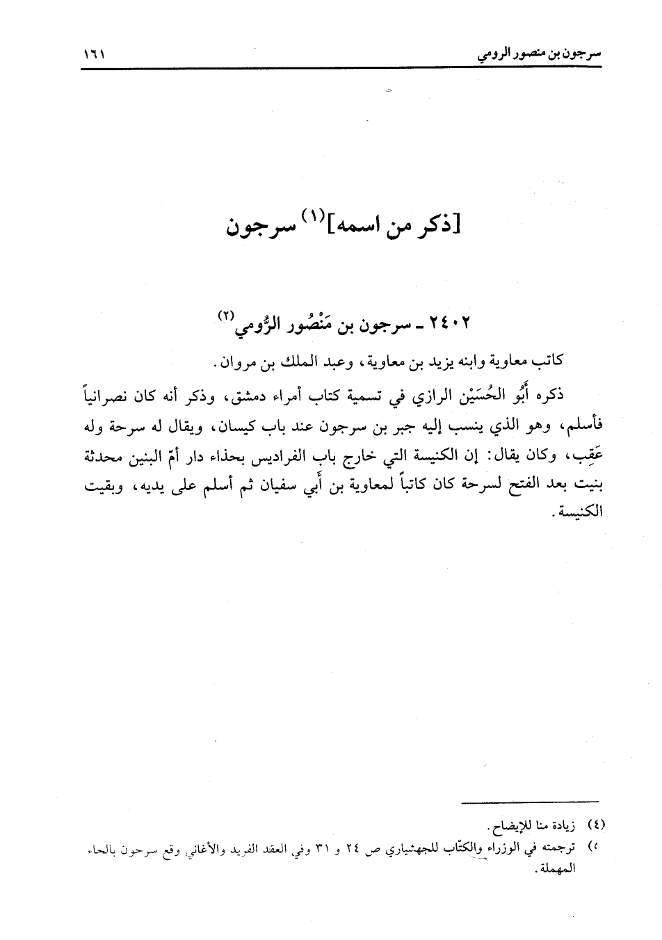 2402 - سرجون بن منصور الرومي (2) كاتب معاوية وابنه يزيد بن معاوية وعبد الملك بن مروان ذكره أبو الحسين الرازي في تسمية كتاب أمراء دمشق وذكر أنه كان نصرانيا فأسلم وهو الذي ينسب إليه جبر بن سرجون عند باب كيسان ويقال له سرحة وله عقب وكان يقال إن الكنيسة التي خارج باب الفراديس بحذاء دار أم البنين محدثة بنيت بعد الفتح لسرحة كان كاتبا لمعاوية بن أبي سفيان ثم أسلم على يديه وبقيت الكنيسة