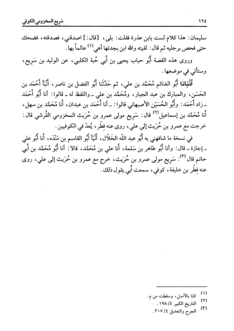 سليمان هذا كلام لست بابن عذرة فقلت بلى قال اصدقني فصدقته فضحك حتى فحص برجليه ثم قال لقيته والله ابن بجدتها أهي (1) عالما بها وروى هذه القصة أبو حباب يحيى بن أبي حبة الكلبي عن الوليد بن سريع وستأتي في موضعها أنبأنا أبو الغنائم محمد بن علي ثم حدثنا أبو الفضل بن ناصر أنبأ أحمد بن الحسن والمبارك بن عبد الجبار ومحمد بن علي واللفظ له قالوا أنا أبو أحمد زاد أحمد وأبو الحسين الأصبهاني قالوا أنا أحمد بن عبدان أنا محمد بن سهل أنا محمد بن إسماعيل (2) قال سريع مولى عمرو بن حريث المخزومي القرشي قال خرجت مع عمرو بن حريث إلى علي روى عنه فطر يعد في الكوفيين في نسخة ما شافهني به أبو عبد الله الخلال أنبأ أبو القاسم بن منده أنا أبو علي إجازة قال وأنا أبو طاهر بن سلمة أنا علي بن محمد قالا أنا أبو محمد بن أبي حاتم قال (3) سريع مولى عمرو بن حريث خرج مع عمرو بن حريث إلى علي روى عنه فطر بن خليفة كوفي سمعت أبي يقول ذلك