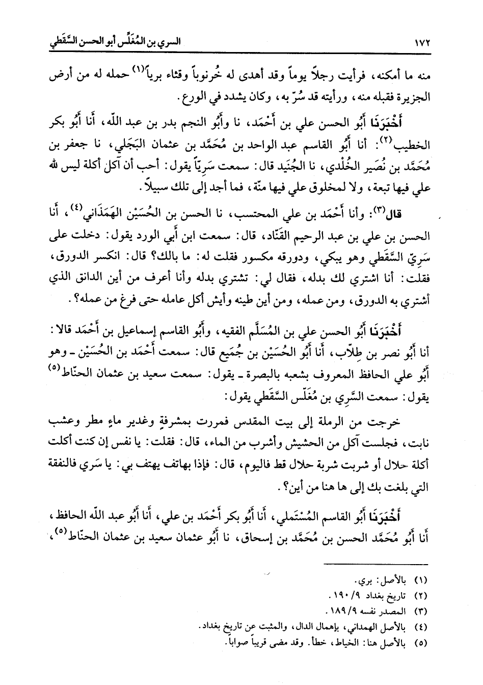 منه ما أمكنه فرأيت رجلا يوما وقد أهدى له خرنوبا وقثاء بريا (1) حمله له من أرض الجزيرة فقبله منه ورأيته قد سر به وكان يشدد في الورع أخبرنا أبو الحسن علي بن أحمد نا وأبو النجم بدر بن عبد الله أنا أبو بكر الخطيب (2) أنا أبو القاسم عبد الواحد بن محمد بن عثمان البجلي نا جعفر بن محمد بن نصير الخلدي نا الجنيد قال سمعت سريا يقول أحب أن آكل أكلة ليس لله علي فيها تبعة ولا لمخلوق علي فيها منة فما أجد إلى تلك سبيلا قال (3) وأنا أحمد بن علي المحتسب نا الحسن بن الحسين الهمذاني (4) أنا الحسن بن علي بن عبد الرحيم القناد قال سمعت ابن أبي الورد يقول دخلت على سري السقطي وهو يبكي ودورقه مكسور فقلت له ما بالك قال انكسر الدورق فقلت أنا اشتري لك بدله فقال لي تشتري بدله وأنا أعرف من أين الدانق الذي أشتري به الدورق ومن عمله ومن أين طينه وأيش أكل عامله حتى فرغ من عمله أخبرنا أبو الحسن علي بن المسلم الفقيه وأبو القاسم إسماعيل بن أحمد قالا أنا أبو نصر بن طلاب أنا أبو الحسين بن جميع قال سمعت أحمد بن الحسين وهو أبو علي الحافظ المعروف بشعبه بالبصرة يقول سمعت سعيد بن عثمان الحناط (5) يقول سمعت السري بن مغلس السقطي يقول خرجت من الرملة إلى بيت المقدس فمررت بمشرفة وغدير ماء مطر وعشب نابت فجلست آكل من الحشيش وأشرب من الماء قال فقلت يا نفس إن كنت أكلت أكلة حلال أو شربت شربة حلال قط فاليوم قال فإذا بهاتف يهتف بي يا سري فالنفقة التي بلغت بك إلى ها هنا من أين أخبرنا أبو القاسم المستملي أنا أبو بكر أحمد بن علي أنا أبو عبد الله الحافظ أنا أبو محمد الحسن بن محمد بن إسحاق نا أبو عثمان سعيد بن عثمان الحناط (5)