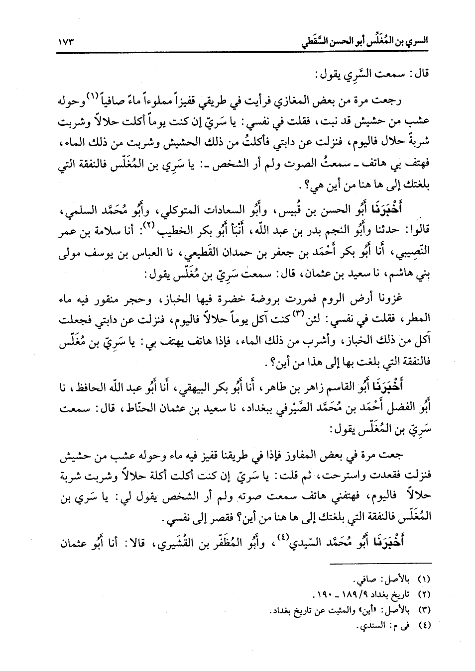 قال سمعت السري يقول رجعت مرة من بعض المغازي فرأيت في طريقي قفيزا مملوءا ماء صافيا (1) وحوله عشب من حشيش قد نبت فقلت في نفسي يا سري إن كنت يوما أكلت حلالا وشربت شربة حلال فاليوم فنزلت عن دابتي فأكلت من ذلك الحشيش وشربت من ذلك الماء فهتف بي هاتف سمعت الصوت ولم أر الشخص يا سري بن المغلس فالنفقة التي بلغتك إلى ها هنا من أين هي أخبرنا أبو الحسن بن قبيس وأبو السعادات المتوكلي وأبو محمد السلمي قالوا حدثنا وأبو النجم بدر بن عبد الله أنبأ أبو بكر الخطيب (2) أنا سلامة بن عمر النصيبي أنا أبو بكر أحمد بن جعفر بن حمدان القطيعي نا العباس بن يوسف مولى بني هاشم نا سعيد بن عثمان قال سمعت سري بن مغلس يقول غزونا أرض الروم فمررت بروضة خضرة فيها الخباز وحجر منقور فيه ماء المطر فقلت في نفسي لئن (3) كنت آكل يوما حلالا فاليوم فنزلت عن دابتي فجعلت آكل من ذلك الخباز وأشرب من ذلك الماء فإذا هاتف يهتف بي يا سري بن مغلس فالنفقة التي بلغت بها إلى هذا من أين أخبرنا أبو القاسم زاهر بن طاهر أنا أبو بكر البيهقي أنا أبو عبد الله الحافظ نا أبو الفضل أحمد بن محمد الصيرفي ببغداد نا سعيد بن عثمان الحناط قال سمعت سري بن المغلس يقول جعت مرة في بعض المفاوز فإذا في طريقنا قفيز فيه ماء وحوله عشب من حشيش فنزلت فقعدت واسترحت ثم قلت يا سري إن كنت أكلت أكلة حلالا وشربت شربة حلالا فاليوم فهتفني هاتف سمعت صوته ولم أر الشخص يقول لي يا سري بن المغلس فالنفقة التي بلغتك إلى ها هنا من أين فقصر إلى نفسي أخبرنا أبو محمد السيدي (4) وأبو المظفر بن القشيري قالا أنا أبو عثمان