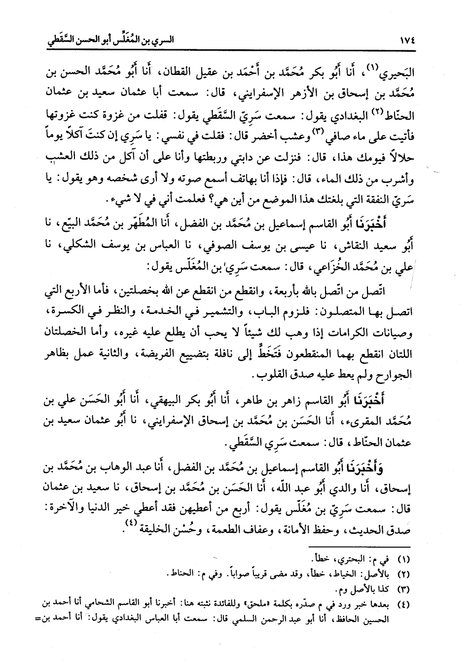 (4) بعدها خبر ورد في م صدره بكلمة " ملحق " وللفائدة نثبته هنا: أخبرنا أبو القاسم الشحامي أنا أحمد بن الحسين الحافظ أنا أبو عبد الرحمن السلمي قال: سمعت أبا العباس البغدادي يقول: أنا أحمد بن