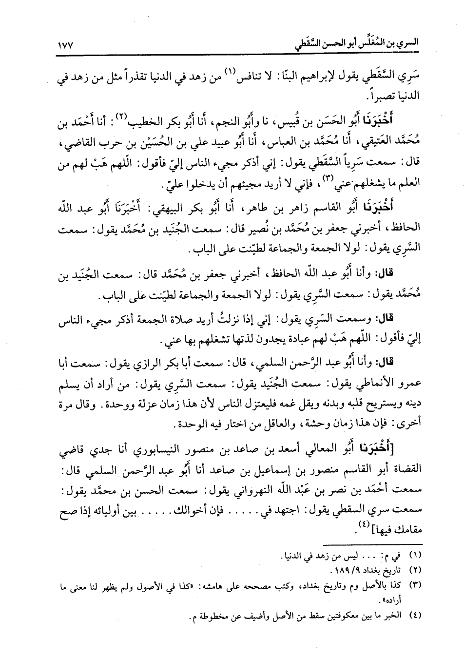 سري السقطي يقول لإبراهيم البنا لا تنافس (1) من زهد في الدنيا تقذرا مثل من زهد في الدنيا تصبرا أخبرنا أبو الحسن بن قبيس نا وأبو النجم أنا أبو بكر الخطيب (2) أنا أحمد بن محمد العتيقي أنا محمد بن العباس أنا أبو عبيد علي بن الحسين بن حرب القاضي قال سمعت سريا السقطي يقول إني أذكر مجئ الناس إلي فأقول اللهم هب لهم من العلم ما يشغلهم عني (3) فإني لا أريد مجيئهم أن يدخلوا علي أخبرنا أبو القاسم زاهر بن طاهر أنا أبو بكر البيهقي أخبرنا أبو عبد الله الحافظ أخبرني جعفر بن محمد بن نصير قال سمعت الجنيد بن محمد يقول سمعت السري يقول لولا الجمعة والجماعة لطينت على الباب قال وأنا أبو عبد الله الحافظ أخبرني جعفر بن محمد قال سمعت الجنيد بن محمد يقول سمعت السري يقول لولا الجمعة والجماعة لطينت على الباب قال وسمعت السري يقول إني إذا نزلت أريد صلاة الجمعة أذكر مجئ الناس إلي فأقول اللهم هب لهم عبادة يجدون لذتها تشغلهم بها عني قال وأنا أبو عبد الرحمن السلمي قال سمعت أبا بكر الرازي يقول سمعت أبا عمرو الأنماطي يقول سمعت الجنيد يقول سمعت السري يقول من أراد أن يسلم دينه ويستريح قلبه وبدنه ويقل غمه فليعتزل الناس لأن هذا زمان عزلة ووحدة وقال مرة أخرى فإن هذا زمان وحشة والعاقل من اختار فيه الوحدة أخبرنا أبو المعالي أسعد بن صاعد بن منصور النيسابوري أنا جدي قاضي القضاة أبو القاسم منصور بن إسماعيل بن صاعد أنا أبو عبد الرحمن السلمي قال سمعت أحمد بن نصر بن عبد الله النهرواني يقول سمعت الحسن بن محمد يقول سمعت سري السقطي يقول اجتهد في فإن أخوالك بين أوليائه إذا صح مقامك فيها (4)