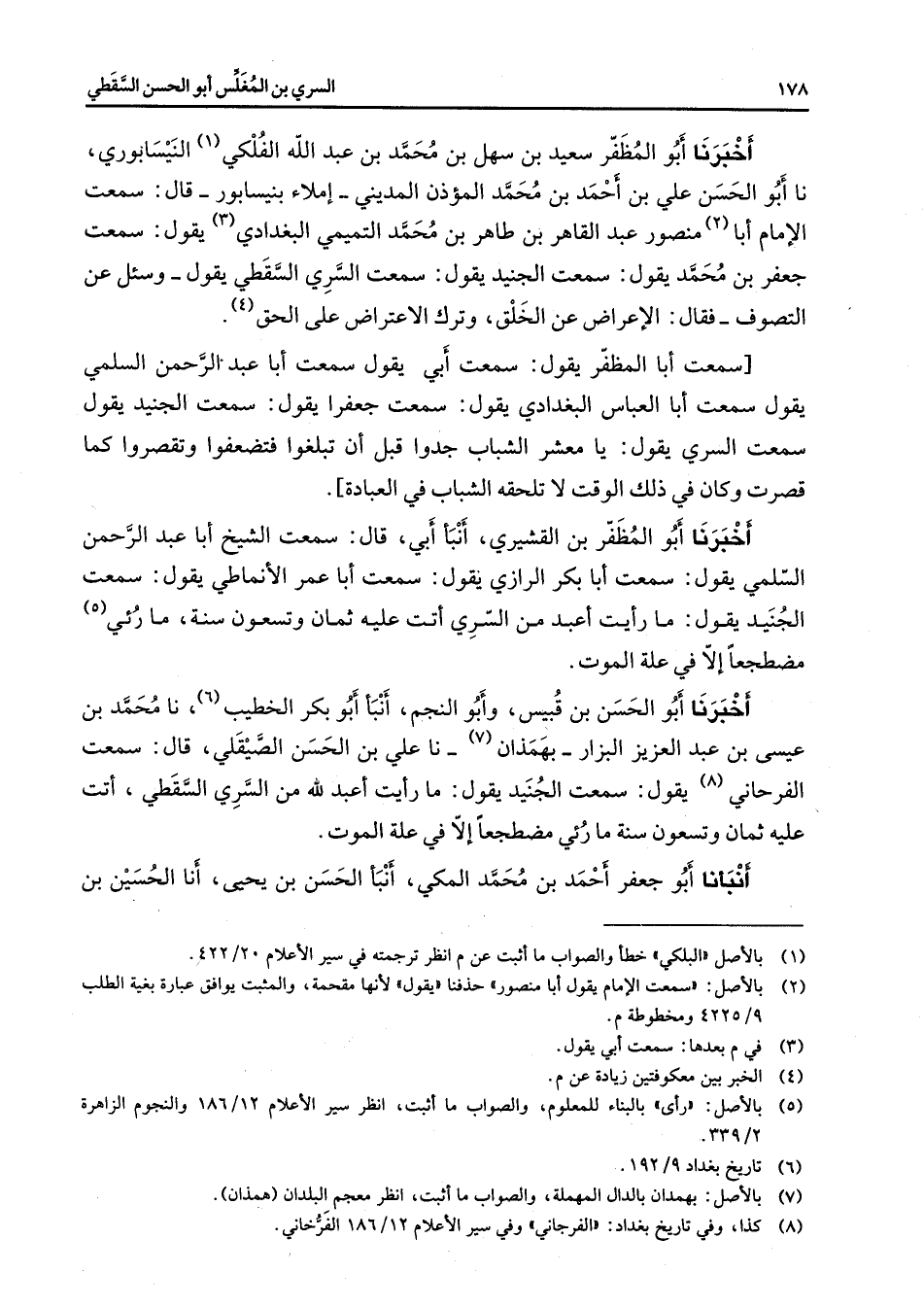أخبرنا أبو المظفر سعيد بن سهل بن محمد بن عبد الله الفلكي (1) النيسابوري نا أبو الحسن علي بن أحمد بن محمد المؤذن المديني إملاء بنيسابور قال سمعت الإمام أبا (2) منصور عبد القاهر بن طاهر بن محمد التميمي البغدادي (3) يقول سمعت جعفر بن محمد يقول سمعت الجنيد يقول سمعت السري السقطي يقول وسئل عن التصوف فقال الإعراض عن الخلق وترك الاعتراض على الحق (4) سمعت أبا المظفر يقول سمعت أبي يقول سمعت أبا عبد الرحمن السلمي يقول سمعت أبا العباس البغدادي يقول سمعت جعفرا يقول سمعت الجنيد يقول سمعت السري يقول يا معشر الشباب جدوا قبل أن تبلغوا فتضعفوا وتقصروا كما قصرت وكان في ذلك الوقت لا تلحقه الشباب في العبادة أخبرنا أبو المظفر بن القشيري أنبأ أبي قال سمعت الشيخ أبا عبد الرحمن السلمي يقول سمعت أبا بكر الرازي يقول سمعت أبا عمر الأنماطي يقول سمعت الجنيد يقول ما رأيت أعبد من السري أتت عليه ثمان وتسعون سنة ما رئي (5) مضطجعا إلا في علة الموت أخبرنا أبو الحسن بن قبيس وأبو النجم أنبأ أبو بكر الخطيب (6) نا محمد بن عيسى بن عبد العزيز البزار بهمذان (7) نا علي بن الحسن الصيقلي قال سمعت الفرحاني (8) يقول سمعت الجنيد يقول ما رأيت أعبد لله من السري السقطي أتت عليه ثمان وتسعون سنة ما رئي مضطجعا إلا في علة الموت أنبأنا أبو جعفر أحمد بن محمد المكي أنبأ الحسن بن يحيى أنا الحسين بن