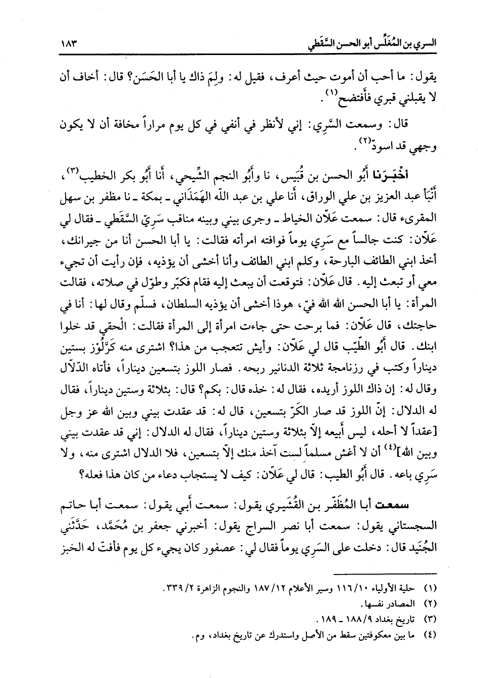 يقول ما أحب أن أموت حيث أعرف فقيل له ولم ذاك يا أبا الحسن قال أخاف أن لا يقبلني قبري فأفتضح (1) قال وسمعت السري إني لأنظر في أنفي في كل يوم مرارا مخافة أن لا يكون وجهي قد اسود (2) أخبرنا أبو الحسن بن قبيس نا وأبو النجم الشيحي أنا أبو بكر الخطيب (3) أنبأ عبد العزيز بن علي الوراق أنا علي بن عبد الله الهمذاني بمكة نا مظفر بن سهل المقرئ قال سمعت علان الخياط وجرى بيني وبينه مناقب سري السقطي فقال لي علان كنت جالسا مع سري يوما فوافته امرأته فقالت يا أبا الحسن أنا من جيرانك أخذ ابني الطائف البارحة وكلم ابني الطائف وأنا أخشى أن يؤذيه فإن رأيت أن تجئ معي أو تبعث إليه قال علان فتوقعت أن يبعث إليه فقام فكبر وطول في صلاته فقالت المرأة يا أبا الحسن الله الله في هوذا أخشى أن يؤذيه السلطان فسلم وقال لها أنا في حاجتك قال علان فما برحت حتى جاءت امرأة إلى المرأة فقالت الحقي قد خلوا ابنك قال أبو الطيب قال لي علان وأيش تتعجب من هذا اشترى منه كرلوز بستين دينارا وكتب في رزنامجة ثلاثة الدنانير ربحه فصار اللوز بتسعين دينارا فأتاه الدلال وقال له إن ذاك اللوز أريده فقال له خذه قال بكم قال بثلاثة وستين دينارا فقال له الدلال إن اللوز قد صار الكر بتسعين قال له قد عقدت بيني وبين الله عز وجل عقدا لا أحله ليس أبيعه إلا بثلاثة وستين دينارا فقال له الدلال إني قد عقدت بيني وبين الله أن لا أغش مسلما لست آخذ منك إلا بتسعين فلا الدلال اشترى منه ولا سري باعه قال أبو الطيب قال لي علان كيف لا يستجاب دعاء من كان هذا فعله سمعت أبا المظفر بن القشيري يقول سمعت أبي يقول سمعت أبا حاتم السجستاني يقول سمعت أبا نصر السراج يقول أخبرني جعفر بن محمد حدثني الجنيد قال دخلت على السري يوما فقال لي عصفور كان يجئ كل يوم فأفت له الخبز