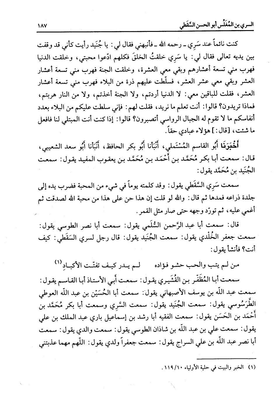 كنت نائما عند سري رحمه الله فأنبهني فقال لي يا جنيد رأيت كأني قد وقفت بين يديه تعالى فقال لي يا سري خلقت الخلق فكلهم ادعوا محبتي وخلقت الدنيا فهرب مني تسعة أعشارهم وبقي معي العشرة وخلقت الجنة فهرب مني تسعة أعشار العشر وبقي معي عشر العشر فسلطت عليهم ذرة من البلاء فهرب مني تسعة أعشار العشر فقلت للباقين معي لا الدنيا أردتم ولا الجنة أخذتم ولا من النار هربتم فماذا تريدون قالوا أنت تعلم ما نريد فقلت لهم فإني سلطت عليكم من البلاء بعدد أنفاسكم ما لا تقوم له الجبال الرواسي أتصبرون قالوا إذا كنت أنت المبتلي لنا فافعل ما شئت قال هؤلاء عبادي حقا أخبرنا أبو القاسم المستملي أنبأنا أبو بكر الحافظ أنبأنا أبو سعد الشعيبي قال سمعت أبا بكر محمد بن أحمد بن محمد بن يعقوب المفيد يقول سمعت الجنيد بن محمد يقول سمعت سري السقطي يقول وقد كلمته يوما في شئ من المحبة فضرب يده إلى جلدة ذراعه فمدها ثم قال والله لو قلت إن هذا حن على هذا من محبة الله لصدقت ثم أغمي عليه ثم تورد وجهه حتى صار مثل القمر قال سمعت أبا عبد الرحمن السلمي يقول سمعت أبا نصر الطوسي يقول سمعت جعفر الخلدي يقول سمعت الجنيد يقول قال رجل لسري السقطي كيف أنت فأنشأ يقول * من لم يتب والحب حشو فؤاده * لم يدر كيف تفتت الأكباد * (1) سمعت أبا المظفر بن القشيري يقول سمعت أبي الأستاذ أبا القاسم يقول سمعت عبد الله بن يوسف الأصبهاني يقول سمعت أبا الحسين بن عبد الله العوطي الطرسوسي يقول سمعت الجنيد يقول سمعت السري وسمعت أبا بكر محمد بن أحمد بن الحسن يقول سمعت الفقيه أبا رشد بن إسماعيل باري عبد الملك بن علي يقول سمعت علي بن عبد الله بن شاذان الطوسي يقول سمعت والدي يقول سمعت أبا نصر عبد الله بن علي السراج يقول سمعت جعفرا ولدي يقول اللهم مهما عذبتني
