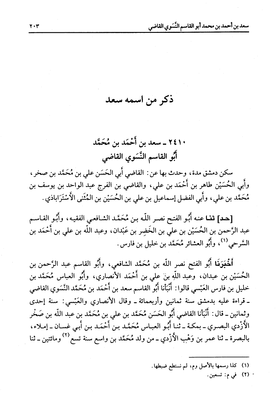 2410 - سعد بن أحمد بن محمد أبو القاسم النسوي القاضي سكن دمشق مدة وحدث بها عن القاضي أبي الحسن علي بن محمد بن صخر وأبي الحسين طاهر بن أحمد بن علي والقاضي بن الفرج عبد الواحد بن يوسف بن محمد بن علي وأبي الفضل إسماعيل بن علي بن الحسين بن المثنى الأستراباذي حدثنا عنه أبو الفتح نصر الله بن محمد الشافعي الفقيه وأبو القاسم عبد الرحمن بن الحسين بن علي بن الخضر بن عبدان وعبد الله بن علي بن أحمد بن السرحي (1) وأبو العشائر محمد بن خليل بن فارس أخبرنا أبو الفتح نصر الله بن محمد الشافعي وأبو القاسم عبد الرحمن بن الحسين بن عبدان وعبد الله بن علي بنأحمد الأنصاري وأبو العباس محمد بن خليل بن فارس العبسي قالوا أنبأنا أبو القاسم سعد بن أحمد بن محمد النسوي القاضي قراءة عليه بدمشق سنة ثمانين وأربعمائة وقال الأنصاري والعبسي سنة إحدى وثمانين قال أنبأنا القاضي أبو الحسن محمد بن علي بن محمد بن عبد الله بن صخر الأزدي البصري بمكة ثنا أبو العباس محمد بن أحمد بن أبي غسان إملاء بالبصرة ثنا عمر بن وهب الأزدي من ولد محمد بن واسع سنة تسع (2) ومائتين ثنا