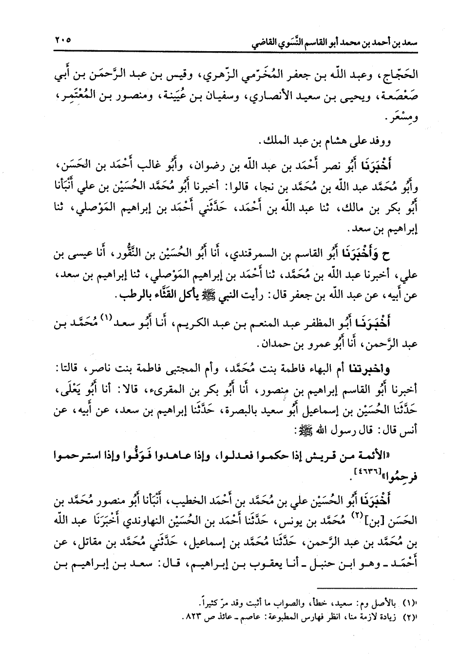 الحجاج وعبد الله بن جعفر المخرمي الزهري وقيس بن عبد الرحمن بن أبي صعصعة ويحيى بن سعيد الأنصاري وسفيان بن عيينة ومنصور بن المعتمر ومسعر ووفد على هشام بن عبد الملك أخبرنا أبو نصر أحمد بن عبد الله بن رضوان وأبو غالب أحمد بن الحسن وأبو محمد عبد الله بن محمد بن نجا قالوا أخبرنا أبو محمد الحسين بن علي أنبأنا أبو بكر بن مالك ثنا عبد الله بنأحمد حدثني أحمد بن إبراهيم الموصلي ثنا إبراهيم بن سعد ح وأخبرنا أبو القاسم بن السمرقندي أنا أبو الحسين بن النقور أنا عيسى بن علي أخبرنا عبد الله بن محمد ثنا أحمد بن إبراهيم الموصلي ثنا إبراهيم بن سعد عن أبيه عن عبد الله بن جعفر قال رأيت النبي (صلى الله عليه وسلم) يأكل القثاء بالرطب أخبرنا أبو المظفر عبد المنعم بن عبد الكريم أنا أبو سعد (1) محمد بن عبد الرحمن أنا أبو عمرو بن حمدان وأخبرتنا أم البهاء فاطمة بنت محمد وأم المجتبى فاطمة بنت ناصر قالتا أخبرنا أبو القاسم إبراهيم بن منصور أنا أبو بكر بن المقرئ قالا أنا أبو يعلى حدثنا الحسين بن إسماعيل أبو سعيد بالبصرة حدثنا إبراهيم بن سعد عن أبيه عن أنس قال قال رسول الله (صلى الله عليه وسلم) الأئمة من قريش إذا حكموا فعدلوا وإذا عاهدوا فوفوا وإذا استرحموا فرحموا