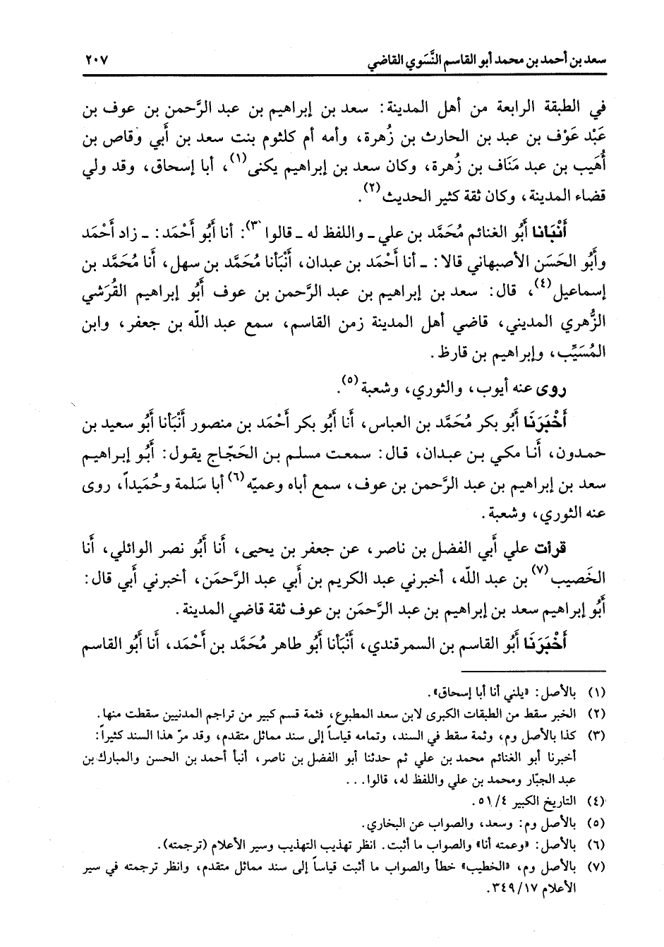 في الطبقة الرابعة من أهل المدينة سعد بن إبراهيم بن عبد الرحمن بن عوف بن عبد عوف بن عبد بن الحارث بن زهرة وأمه أم كلثوم بنت سعد بن أبي وقاص بن أهيب بن عبد مناف بن زهرة وكان سعد بن إبراهيم يكنى (1) أبا إسحاق وقد ولي قضاء المدينة وكان ثقة كثير الحديث (2) أنبأنا أبو الغنائم محمد بن علي واللفظ له قالوا (3) أنا أبو أحمد زاد أحمد وأبو الحسن الأصبهاني قالا أنا أحمد بن عبدان أنبأنا محمد بن سهل أنا محمد بن إسماعيل (4) قال سعد بن إبراهيم بن عبد الرحمن بن عوف أبو إبراهيم القرشي الزهري المديني قاضي أهل المدينة زمن القاسم سمع عبد الله بن جعفر وابن المسيب وإبراهيم بن قارظ روى عنه أيوب والثوري وشعبة (5) أخبرنا أبو بكر محمد بن العباس أنا أبو بكر أحمد بن منصور أنبأنا أبو سعيد بن حمدون أنا مكي بن عبدان قال سمعت مسلم بن الحجاج يقول أبو إبراهيم سعد بن إبراهيم بن عبد الرحمن بن عوف سمع أباه وعميه (6) أبا سلمة وحميدا روى عنه الثوري وشعبة قرأت علي أبي الفضل بن ناصر عن جعفر بن يحيى أنا أبو نصر الوائلي أنا الخصيب (7) بن عبد الله أخبرني عبد الكريم بن أبي عبد الرحمن أخبرني أبي قال أبو إبراهيم سعد بن إبراهيم بن عبد الرحمن بن عوف ثقة قاضي المدينة أخبرنا أبو القاسم بن السمرقندي أنبأنا أبو طاهر محمد بن أحمد أنا أبو القاسم