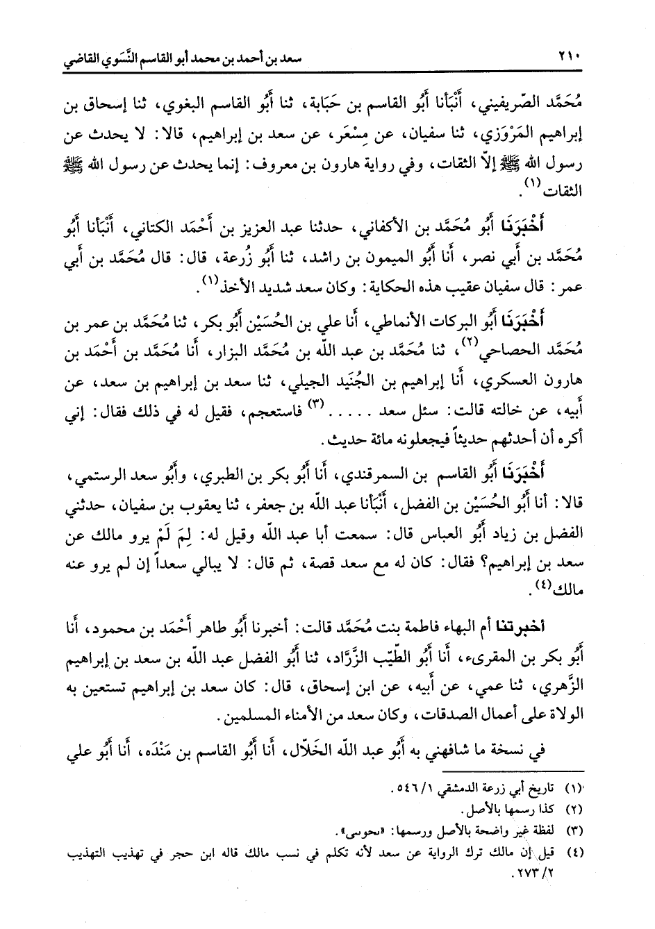 محمد الصريفيني أنبأنا أبو القاسم بن حبابة ثنا أبو القاسم البغوي ثنا إسحاق بن إبراهيم المروزي ثنا سفيان عن مسعر عن سعد بن إبراهيم قالا لا يحدث عن رسول الله (صلى الله عليه وسلم) إلا الثقات وفي رواية هارون بن معروف إنما يحدث عن رسول الله (صلى الله عليه وسلم) الثقات (1) أخبرنا أبو محمد بن الأكفاني حدثنا عبد العزيز بن أحمد الكتاني أنبأنا أبو محمد بن أبي نصر أنا أبو الميمون بن راشد ثنا أبو زرعة قال قال محمد بن أبي عمر قال سفيان عقيب هذه الحكاية وكان سعد شديد الأخذ (1) أخبرنا أبو البركات الأنماطي أنا علي بن الحسين أبو بكر ثنا محمد بن عمر بن محمد الحصاحي (2) ثنا محمد بن عبد الله بن محمد البزار أنا محمد بن أحمد بن هارون العسكري أنا إبراهيم بن الجنيد الجيلي ثنا سعد بن إبراهيم بن سعد عن أبيه عن خالته قالت سئل سعد (3) فاستعجم فقيل له في ذلك فقال إني أكره أن أحدثهم حديثا فيجعلونه مائة حديث أخبرنا أبو القاسم بن السمرقندي أنا أبو بكر بن الطبري وأبو سعد الرستمي قالا أنا أبو الحسين بن الفضل أنبأنا عبد الله بن جعفر ثنا يعقوب بن سفيان حدثني الفضل بن زياد أبو العباس قال سمعت أبا عبد الله وقيل له لم لم يرو مالك عن سعد بن إبراهيم فقال كان له مع سعد قصة ثم قال لا يبالي سعدا إن لم يرو عنه مالك (4) أخبرتنا أم البهاء فاطمة بنت محمد قالت أخبرنا أبو طاهر أحمد بن محمود أنا أبو بكر بن المقرئ أنا أبو الطيب الزراد ثنا أبو الفضل عبد الله بن سعد بن إبراهيم الزهري ثنا عمي عن أبيه عن ابن إسحاق قال كان سعد بن إبراهيم تستعين به الولاة على أعمال الصدقات وكان سعد من الأمناء المسلمين في نسخة ما شافهني به أبو عبد الله الخلال أنا أبو القاسم بن منده أنا أبو علي