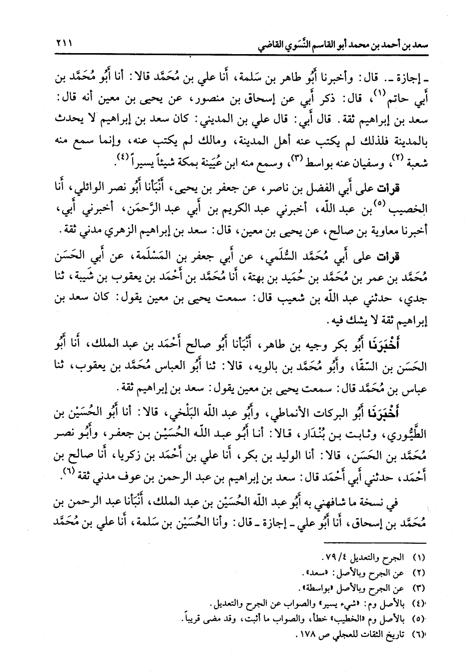 إجازة قال وأخبرنا أبو طاهر بن سلمة أنا علي بن محمد قالا أنا أبو محمد بن أبي حاتم (1) قال ذكر أبي عن إسحاق بن منصور عن يحيى بن معين أنه قال سعد بن إبراهيم ثقة قال أبي قال علي بن المديني كان سعد بن إبراهيم لا يحدث بالمدينة فلذلك لم يكتب عنه أهل المدينة ومالك لم يكتب عنه وإنما سمع منه شعبة (2) وسفيان عنه بواسط (3) وسمع منه ابن عيينة بمكة شيئا يسيرا (4) قرأت على أبي الفضل بن ناصر عن جعفر بن يحيى أنبأنا أبو نصر الوائلي أنا الخصيب (5) بن عبد الله أخبرني عبد الكريم بن أبي عبد الرحمن أخبرني أبي أخبرنا معاوية بن صالح عن يحيى بن معين قال سعد بن إبراهيم الزهري مدني ثقة قرأت على أبي محمد السلمي عن أبي جعفر بن المسلمة عن أبي الحسن محمد بن عمر بن محمد بن حميد بن بهتة أنا محمد بن أحمد بن يعقوب بن شيبة ثنا جدي حدثني عبد الله بن شعيب قال سمعت يحيى بن معين يقول كان سعد بن إبراهيم ثقة لا يشك فيه أخبرنا أبو بكر وجيه بن طاهر أنبأنا أبو صالح أحمد بن عبد الملك أنا أبو الحسن بن السقا وأبو محمد بن بالويه قالا ثنا أبو العباس محمد بن يعقوب ثنا عباس بن محمد قال سمعت يحيى بن معين يقول سعد بن إبراهيم ثقة أخبرنا أبو البركات الأنماطي وأبو عبد الله البلخي قالا أنا أبو الحسين بن الطيوري وثابت بن بندار قالا أنا أبو عبد الله الحسين بن جعفر وأبو نصر محمد بن الحسن قالا أنا الوليد بن بكر أنا علي بن أحمد بن زكريا أنا صالح بن أحمد حدثني أبي احمد قال سعد بن إبراهيم بن عبد الرحمن بن عوف مدني ثقة (6) في نسخة ما شافهني به أبو عبد الله الحسين بن عبد الملك أنبأنا عبد الرحمن بن محمد بن إسحاق أنا أبو علي إجازة قال وأنا الحسين بن سلمة أنا علي بن محمد