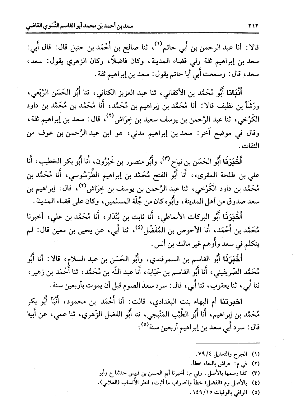 قالا أنا عبد الرحمن بن أبي حاتم (1) ثنا صالح بن أحمد بن حنبل قال قال أبي سعد بن إبراهيم ثقة ولي قضاء المدينة وكان فاضلا وكان الزهري يقول سعد سعد قال وسمعت أبي أبا حاتم يقول سعد بن إبراهيم ثقة أنبأنا أبو محمد بن الأكفاني ثنا عبد العزيز الكتاني ثنا أبو الحسن الربعي ورشأ بن نظيف قالا أنا محمد بن إبراهيم بن محمد أنا محمد بن محمد بن داود الكرخي ثنا عبد الرحمن بن يوسف سعيد بن خراش (2) قال سعد بن إبراهيم ثقة وقال في موضع آخر سعد بن إبراهيم مدني هو ابن عبد الرحمن بن عوف من الثقات أخبرنا أبو الحسن بن نياح (3) وأبو منصور بن خيرون أنا أبو بكر الخطيب أنا علي بن طلحة المقرئ أنا أبو الفتح محمد بن إبراهيم الطرسوسي أنا محمد بن محمد بن داود الكرخي ثنا عبد الرحمن بن يوسف بن خراش (2) قال إبراهيم بن سعد صدوق من أهل المدينة وأبوه كان من جلة المسلمين وكان على قضاء المدينة أخبرنا أبو البركات الأنماطي أنا ثابت بن بندار أنا محمد بن علي أخبرنا محمد بن أحمد أنا الأحوص بن المفضل (4) ثنا أبي عن يحيى بن معين قال لم يتكلم في سعد وأوهم غير مالك بن أنس أخبرنا أبو القاسم بن السمرقندي وأبو الحسن بن عبد السلام قالا أنا أبو محمد الصريفيني أنا أبو القاسم بن حبابة أنا عبد الله بن محمد ثنا أحمد بن زهير ثنا أبي ثنا يعقوب ثنا أبي قال سرد سعد الصوم قبل أن يموت بأربعين سنة أخبرتنا أم البهاء بنت البغدادي قالت أنا أحمد بن محمود أنبأ أبو بكر محمد بن إبراهيم أنا أبو الطيب المنبجي ثنا أبو الفضل الزهري ثنا عمي عن أبيه قال سرد أبي سعد بن إبراهيم أربعين سنة (5)