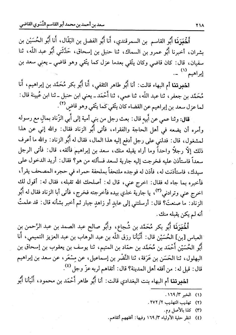 أخبرنا أبو القاسم بن السمرقندي أنا أبو الفضل بن البقال أنا أبو الحسين بن بشران أخبرنا أبو عمرو بن السماك ثنا حنبل بن إسحاق حدثني أبو عبد الله ثنا سفيان قال كان قاضي وكان يتقي بعدما عزل كما يتقي وهو قاضي يعني سعد بن إبراهيم (1) أخبرتنا أم البهاء قالت أنا أبو طاهر الثقفي أنا أبو بكر بن إبراهيم أنا محمد بن جعفر ثنا عبد الله ثنا عبد الله ثنا عمي ثنا أحمد يعني ابن حنبل ثنا ابن عيينة قال لما عزل سعد بن إبراهيم عن القضاء كان يتقي كما يتقي وهو قاض (2) قال وثنا عمي عن أبيه قال بعث رجل من بني أمية إلى أبي الزناد بمال مع رسوله وأمره أن يضعه في أهل الحاجة والفقراء فأتى أبو الزناد فقال والله إني عن هذا لمشغول قال فدلني على رجل أدفع إليه هذا المال فقال له أبو الزناد والله ما أعرف ذلك إلا رجلا واحدا وما أراه يقبله منك سعد بن إبراهيم فألقه قال فأتى الرجل سعدا فاستأذن عليه فخرجت إليه جارية لسعد فسألته من هو فقال أريد الدخول على سيدك فاستأذنت له فأذن له فوجده ملتحفا بملحفة حمراء في حجره المصحف يقرأ فأخبره بما جاء له فقال اخرج عني قال له أصلحك الله تقبله فقال له أقول لك اخرج عني وترادني (3) يا جارية خذي بيده فأخرجته فخرج فأتى أبا الزناد فقال له أبو الزناد ما صنعت قال أرسلتني إلى عابد أو زاهد جبار ثم أخبر بشأنه قال قد علمت أنه لم يكن يقبله منك أخبرنا أبو بكر محمد بن شجاع وأبو صالح عبد الصمد بن عبد الرحمن بن العباس بن الحسين قال أنبأنا رزق الله بن عبد الوهاب بن عبد العزيز التميمي أنا أبو الحسين أحمد بن محمد بن حماد بن المتيم ثنا يوسف بن يعقوب بن إسحاق بن البهلول ثنا الحسن بن عرفة ثنا النضر بن إسماعيل عن مسعر عن سعد بن إبراهيم قال قيل له من أفقه أهل المدينة قال أتقاهم لربه عز وجل (4) أخبرتنا أم البهاء بنت البغدادي قالت أنا أبو طاهر أحمد بن محمود أنبأنا أبو