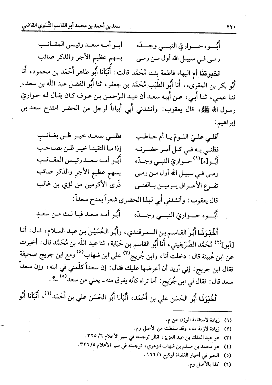 * أبوه حواري النبي وجده * أبو أمه سعد رئيس المقانب رمى في سبيل الله أول من رمى * بسهم عظيم الأجر والذكر صائب * أخبرتنا أم البهاء فاطمة بنت محمد قالت أنبأنا أبو طاهر أحمد بن محمود أنا أبو بكر بن المقرئ أنا أبو الطيب محمد بن جعفر ثنا أبو الفضل عبد الله بن سعد ثنا عمي ثنا أبي عن أبيه سعد أن عبد الرحمن بن عوف كان يقال له حواري رسول الله (صلى الله عليه وسلم) قال يعقوب وأنشدني أبي أبياتا لرجل من الحضر امتدح سعد بن إبراهيم * أقلي علي اللوم يا أم حاطب * فظني بسعد خير ظن بغائب فظني به في كل أمر حضرته * إذا ما التقينا خير ظن بصاحب أبوه حواري النبي وجده * أبو أمه سعد رئيس المقانب رمى في سبيل الله أول من رمى * بسهم عظيم الأجر والذكر صائب تفرع الأعراق يرمين بالفتى * ذرى الأكرمين من لؤي بن غالب * قال يعقوب وأنشدني أبي لهذا الحضري شعرا يمدح سعدا * أبوه حواري النبي وجده * أبو أمه سعد فيا لك من سعد أخبرنا أبو القاسم بن السمرقندي وأبو الحسين بن عبد السلام قال أنا أبو (2) محمد الصريفيني أنا أبو القاسم بن حبابة ثنا عبد الله بن محمد قال أخبرت عن ابن عيينة قال دخلت أنا وابن جريج (3) على ابن شهاب (4) ومع ابن جريج صحيفة فقال ابن جريج إني أريد أن أعرضها عليك فقال إن سعدا كلمني في ابنه وإن سعدا سعد قاتل فقال لي ابن جريج أما تراه كأنه يفرق منه يعني من سعد (5) أخبرنا أبو الحسن علي بنأحمد أنبأنا أبو الحسن علي بن أحمد (6) أنبأنا أبو