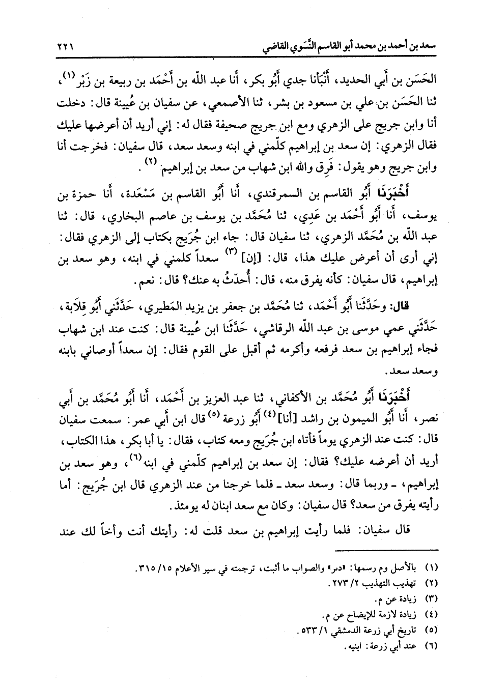 الحسن بن أبي الحديد أنبأنا جدي أبو بكر أنا عبد الله بنأحمد بن ربيعة بن زبر (1) ثنا الحسن بن علي بن مسعود بن بشر ثنا الأصمعي عن سفيان بن عيينة قال دخلت أنا وابن جريج على الزهري ومع ابن جريج صحيفة فقال له إني أريد أن أعرضها عليك فقال الزهري إن سعد بن إبراهيم كلمني في ابنه وسعد سعد قال سفيان فخرجت أنا وابن جريج وهو يقول فرق والله ابن شهاب من سعد بن إبراهيم (2) أخبرنا أبو القاسم بن السمرقندي أنا أبو القاسم بن مسعدة أنا حمزة بن يوسف أنا أبو أحمد بن عدي ثنا محمد بن يوسف بن عاصم البخاري قال ثنا عبد الله بن محمد الزهري ثنا سفيان قال جاء ابن جريج بكتاب إلى الزهري فقال إني أرى أن أعرض عليك هذا عليك هذا قال إن (3) سعدا كلمني في ابنه وهو سعد بن إبراهيم قال سفيان كأنه يفرق منه قال أحدث به عنك قال نعم قال وحدثنا أبو أحمد ثنا محمد بن جعفر بن يزيد المطيري حدثني أبو قلابة حدثني عمي موسى بن عبد الله الرقاشي حدثنا ابن عيينة قال كنت عند ابن شهاب فجاء إبراهيم بن سعد فرفعه وأكرمه ثم أقبل على القوم فقال إن سعدا أوصاني بابنه وسعد سعد أخبرنا أبو محمد بن الأكفاني ثنا عبد العزيز بن أحمد أنا أبو محمد بن أبي نصر أنا أبو الميمون بن راشد (4) أنا أبو زرعة (5) قال ابن أبي عمر سمعت سفيان قال كنت عند الزهري يوما فأتاه ابن جريج ومعه كتاب فقال يا أبا بكر هذا الكتاب أريد أن أعرضه عليك فقال إن سعد بن إبراهيم كلمني في ابنه (6) وهو سعد بن إبراهيم وربما قال سعد سعد فلما خرجنا من عند الزهري قال ابن جريج أما رأيته يفرق من سعد قال سفيان وكان مع سعد ابنان له يومئذ قال سفيان فلما رأيت إبراهيم بن سعد قلت له رأيتك أنت وأخا لك عند