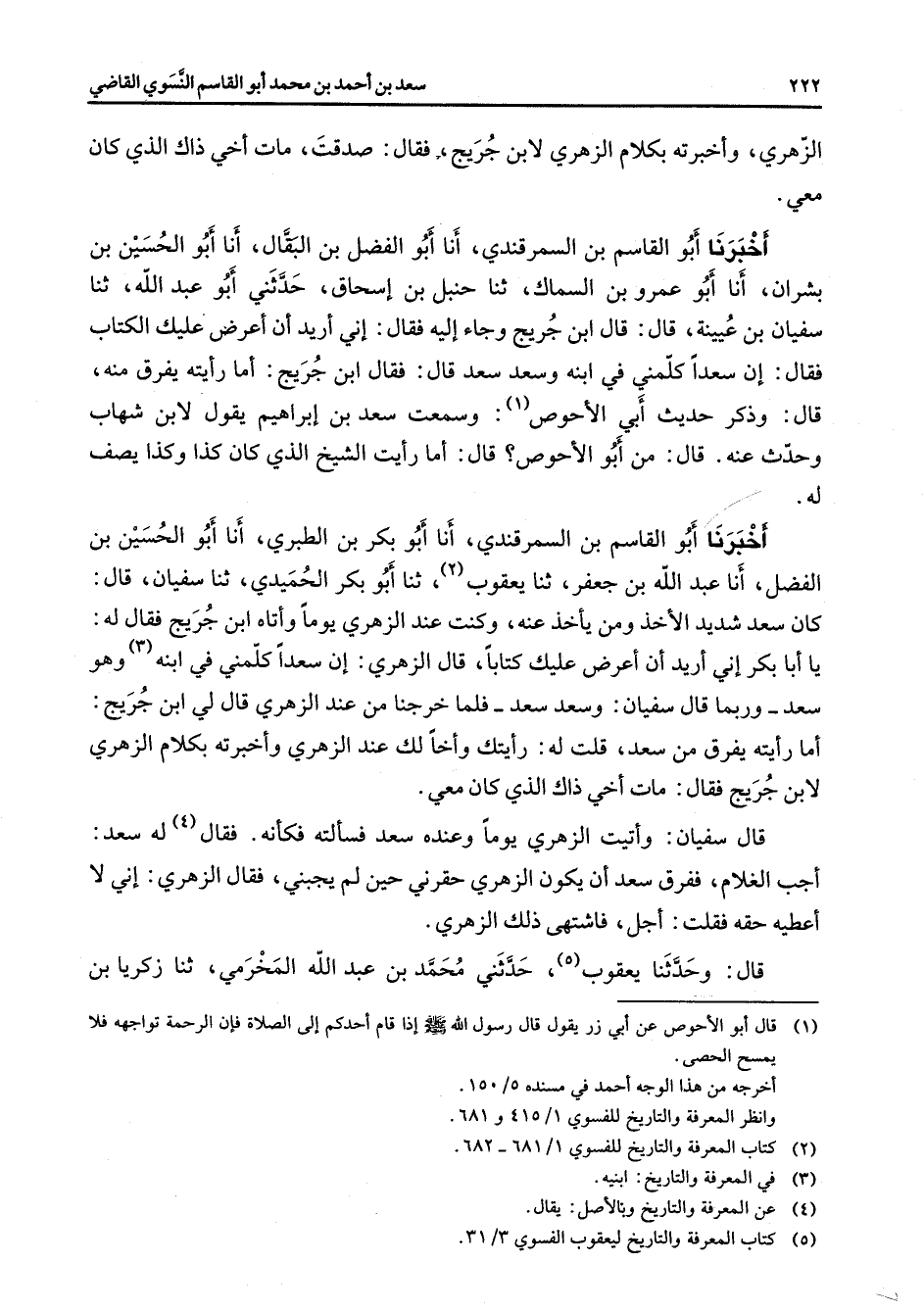 الزهري وأخبرته بكلام الزهري لابن جريج فقال صدقت مات أخي ذاك الذي كان معي أخبرنا أبو القاسم بن السمرقندي أنا أبو الفضل بن البقال أنا أبو الحسين بن بشران أنا أبو عمرو بن السماك ثنا حنبل بن إسحاق حدثني أبو عبد الله ثنا سفيان بن عيينة قال قال ابن جريج وجاء إليه فقال إني أريد أن أعرض عليك الكتاب فقال إن سعدا كلمني في ابنه وسعد سعد قال فقال ابن جريج أما رأيته يفرق منه قال وذكر حديث أبي الأحوص (1) وسمعت سعد بن إبراهيم يقول لابن شهاب وحدث عنه قال من أبو الأحوص قال أما رأيت الشيخ الذي كان كذا وكذا يصف له أخبرنا أبو القاسم بن السمرقندي أنا أبو بكر بن الطبري أنا أبو الحسين بن الفضل أنا عبد الله بن جعفر ثنا يعقوب (2) ثنا أبو بكر الحميدي ثنا سفيان قال كان سعد شديد الأخذ ومن يأخذ عنه وكنت عند الزهري يوما وأتاه ابن جريج فقال له يا أبا بكر إني أريد أن أعرض عليك كتابا قال الزهري إن سعدا كلمني في ابنه (3) وهو سعد وربما قال سفيان وسعد سعد فلما خرجنا من عند الزهري قال لي ابن جريج أما رأيته يفرق من سعد قلت له رأيتك وأخا لك عند الزهري وأخبرته بكلام الزهري لابن جريج فقال مات أخي ذاك الذي كان معي قال سفيان وأتيت الزهري يوما وعنده سعد فسألته فكأنه فقال (4) له سعد أجب الغلام ففرق سعد أن يكون الزهري حقرني حين لم يجبني فقال الزهري إني لا أعطيه حقه فقلت أجل فاشتهى ذلك الزهري قال وحدثنا يعقوب (5) حدثني محمد بن عبد الله المحرمي ثنا زكريا بن