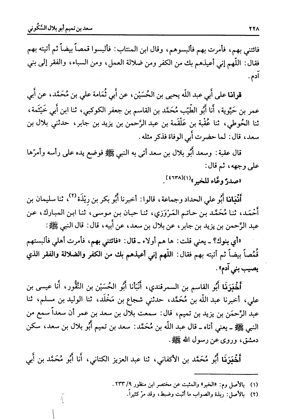 [4638] أنبأنا أبو علي الحداد وجماعة قالوا أخبرنا أبو بكر بن ريذة (2) ثنا سليمان بن أحمد ثنا محمد بن حاتم المروزي ثنا حبان بن موسى ثنا ابن المبارك عن عبد الرحمن بن يزيد بن جابر عن بلال بن سعد عن أبيه قال قال النبي (صلى الله عليه وسلم) أي بنوك يعني قلت ها هم أولاء قال فائتني بهم فأمرت أهلي فألبستهم قمصا بيضا ثم أتيته بهم فقال اللهم إني أعيذهم بك من الكفر والضلالة والفقر الذي يصيب بني آدم أخبرنا أبو القاسم بن السمرقندي أنبأنا أبو الحسين بن النقور أنا عيسى بن علي أخبرنا عبد الله بن محمد حدثني شجاع بن مخلد ثنا الوليد بن مسلم ثنا عبد الرحمن بن يزيد بن تميم قال سمعت بلال بن سعد بن عمر أن سعدا سمع من النبي (صلى الله عليه وسلم) يعني أتاه قال عبد الله بن محمد سعد بن تميم أبو بلال بن سعد سكن دمشق وروى عن رسول الله (صلى الله عليه وسلم) أخبرنا أبو محمد بن الأكفاني ثنا عبد العزيز الكتاني أنا أبو محمد بن أبي