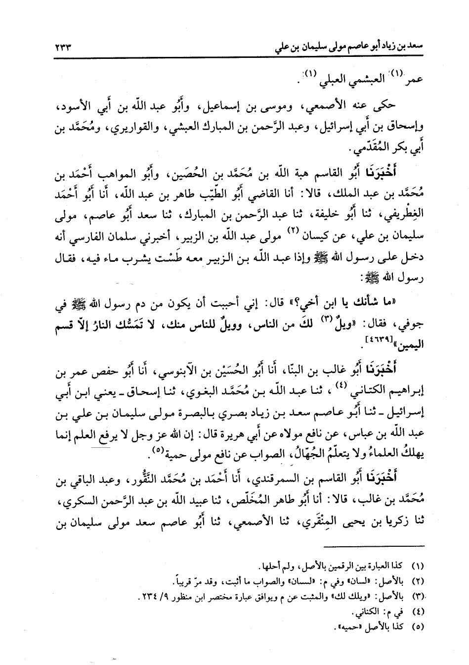 [4639] أخبرنا أبو غالب بن البنا أنا أبو الحسين بن الآبنوسي أنا أبو حفص عمر بن إبراهيم الكتاني (4) ثنا عبد الله بن محمد البغوي ثنا إسحاق يعني ابن أبي إسرائيل ثنا أبو عاصم سعد بن زياد بصري بالبصرة مولى سليمان بن علي بن عبد الله بن عباس عن نافع مولاه عن أبي هريرة قال إن الله عز وجل لا يرفع العلم إنما يهلك العلماء ولا يتعلم الجهال الصواب عن نافع مولى حمية (5) أخبرنا أبو القاسم بن السمرقندي أنا أحمد بن محمد النقور وعبد الباقي بن محمد بن غالب قالا أنا أبو طاهر المخلص ثنا عبيد الله بن عبد الرحمن السكري ثنا زكريا بن يحيى المنقري ثنا الأصمعي ثنا أبو عاصم سعد مولى سليمان بن