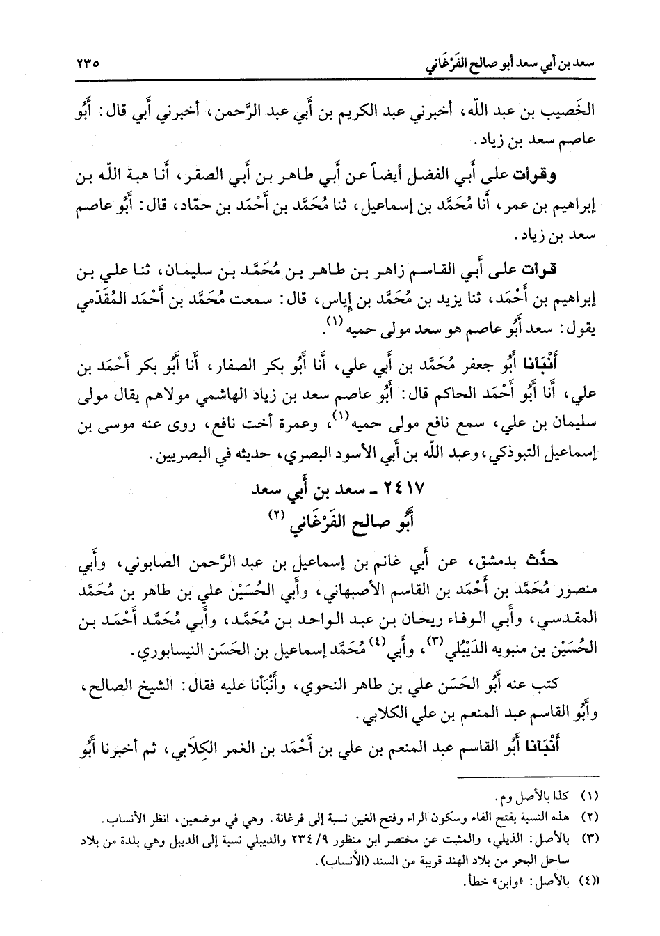 2417 - سعد بن أبي سعد أبو صالح الفرغاني (2) حدث بدمشق عن أبي غانم بن إسماعيل بن عبد الرحمن الصابوني وأبي منصور محمد بن أحمد بن القاسم الأصبهاني وأبي الحسين علي بن طاهر بن محمد المقدسي وأبي الوفاء ريحان بن عبد الواحد بن محمد وأبي محمد أحمد بن الحسين بن منبويه الديبلي (3) وأبي (4) محمد إسماعيل بن الحسن النيسابوري كتب عنه أبو الحسن علي بن طاهر النحوي وأنبأنا عليه فقال الشيخ الصالح وأبو القاسم عبد المنعم بن علي الكلابي أنبأنا أبو القاسم عبد المنعم بن علي بن أحمد بن الغمر الكلابي ثم أخبرنا أبو