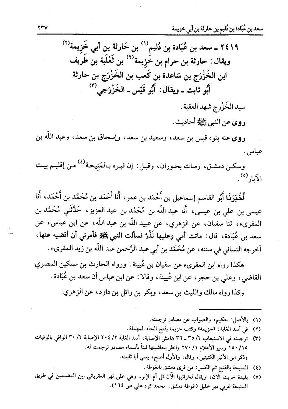 2419 - سعد بن عبادة بن دليم (1) بن حارثة بن أبي خزيمة (2) ويقال حارثة بن حرام بن خزيمة (2) بن ثعلبة بن طريف ابن الخزرج بن ساعدة بن كعب بن الخزرج بن حارثة أبو ثابت ويقال أبو قيس الخزرجي (3) سيد الخزرج شهد العقبة روى عن النبي (صلى الله عليه وسلم) أحاديث روى عنه بنوه قيس بن سعد وسعيد بن سعد وإسحاق بن سعد وعبد الله بن عباس وسكن دمشق ومات بحوران وقيل إن قبره بالمنيحة (4) من إقليم بيت الآبار (5) أخبرنا أبو القاسم إسماعيل بن أحمد بن عمر أنا أحمد بن محمد بن أحمد أنا عيسى بن علي بن عيسى أنا عبد الله بن محمد بن عبد العزيز حدثني محمد بن المقرئ ثنا سفيان عن الزهري عن عبيد الله بن عبد الله عن ابن عباس عن سعد بن عبادة قال ماتت أمي وعليها نذر فسألت النبي (صلى الله عليه وسلم) فأمرني أن أقضيه عنها أخرجه النسائي في سننه عن محمد بن أبي عبد الرحمن بن زيد المقرئ هكذا رواه ابن المقرئ عن سفيان بن عيينة ورواه الحارث بن مسكين المصري القاضي وعلي بن حجر عن ابن عيينة وقالا عن ابن عباس أن سعد بن عبادة وكذا رواه مالك والليث بن سعد وبكر بن وائل بن داود عن الزهري