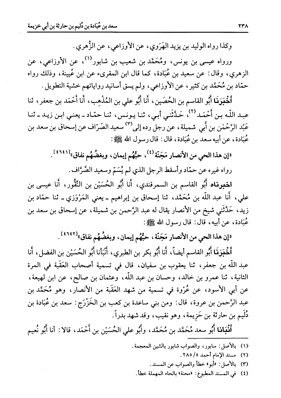 وكذا رواه الوليد بن يزيد الهروي عن الأوزاعي عن الزهري ورواه عيسى بن يونس ومحمد بن شعيب بن شابور (1) عن الأوزاعي عن الزهري وقال عن سعيد بن عبادة كما قال ابن المقرئ عن ابن عيينة وذلك رواه حماد بن محمد بن كثير عن الأوزاعي ولم يسق أسانيد رواياتهم خشية التطويل أخبرنا أبو القاسم بن الحصين أنا أبو علي بن المذهب أنا أحمد بن جعفر ثنا عبد الله بن أحمد (2) حدثني أبي ثنا يونس ثنا حماد يعني ابن زيد ثنا عبد الرحمن بن أبي شميلة عن رجل رده إلى (3) سعيد الصراف عن إسحاق بن سعد بن عبادة عن أبيه سعد بن عبادة قال قال رسول الله (صلى الله عليه وسلم) إن هذا الحي من الأنصار مجنة (4) حبهم إيمان وبغضهم نفاق