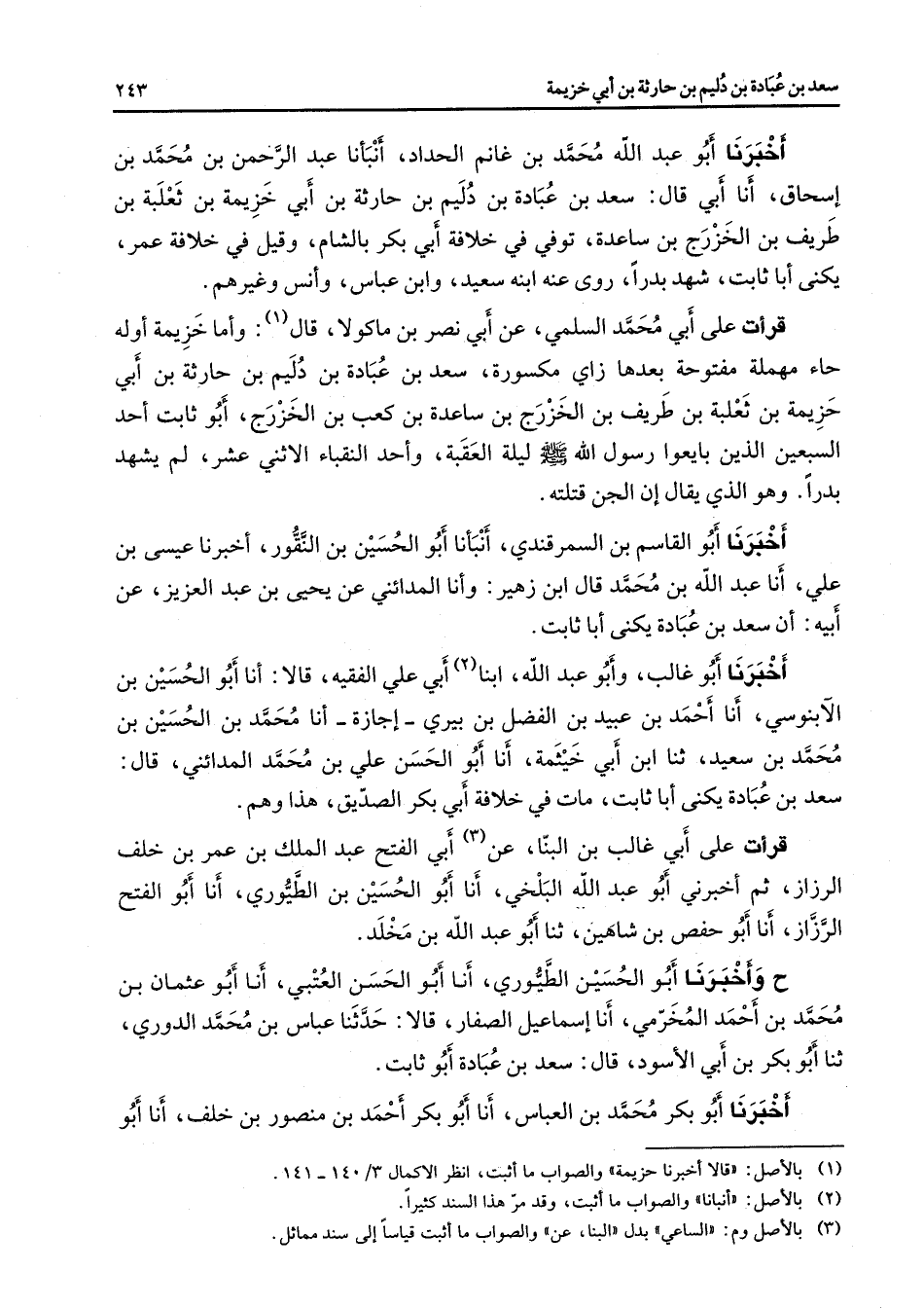 أخبرنا أبو عبد الله محمد بن غانم الحداد أنبأنا عبد الرحمن بن محمد بن إسحاق أنا أبي قال سعد بن عبادة بن دليم بن حارثة بن أبي خزيمة بن ثعلبة بن طريف بن الخزرج بن ساعدة توفي في خلافة أبي بكر بالشام وقيل في خلافة عمر يكنى أبا ثابت شهد بدرا روى عنه ابنه سعيد وابن عباس وأنس وغيرهم قرأت على أبي محمد السلمي عن أبي نصر بن ماكولا قال (1) وأما خزيمة أوله حاء مهملة مفتوحة بعدها زاي مكسورة سعد بن عبادة بن دليم بن حارثة بن أبي خزيمة بن ثعلبة بن طريف بن الخزرج بن ساعدة بن كعب بن الخزرج أبو ثابت أحد السبعين الذين بايعوا رسول الله (صلى الله عليه وسلم) ليلة العقبة وأحد النقباء الاثني عشر لم يشهد بدرا وهو الذي يقال إن الجن قتلته أخبرنا أبو القاسم السمرقندي أنبأنا أبو الحسين بن النقور أخبرنا عيسى بن علي أنا عبد الله بن محمد قال ابن زهير وأنا المدائني عن يحيى بن عبد العزيز عن أبيه أن سعد بن عبادة يكنى أبا ثابت أخبرنا أبو غالب وأبو عبد الله ابنا (2) أبي علي الفقيه قالا أنا أبو الحسين بن الآبنوسي أنا أحمد بن عبيد بن الفضل بن بيري إجازة أنا محمد بن الحسين بن محمد بن سعيد ثنا ابن أبي خيثمة أنا أبو الحسن علي بن محمد المدائني قال سعد بن عبادة يكنى أبا ثابت مات في خلافة أبي بكر الصديق هذا وهم قرأت على أبي غالب بن البنا عن (3) أبي الفتح عبد الملك بن عمر بن خلف الرزاز ثم أخبرني أبو عبد الله البلخي أنا أبو الحسين بن الطيوري أنا أبو الفتح الرزاز أنا أبو حفص بن شاهين ثنا أبو عبد الله بن مخلد ح وأخبرنا أبو الحسين الطيوري أنا أبو الحسن العتبي أنا أبو عثمان بن محمد بن أحمد المخرمي أنا إسماعيل الصفار قالا حدثنا عباس بن محمد الدوري ثنا أبو بكر بن أبي الأسود قال سعد بن عبادة أبو ثابت أخبرنا أبو بكر محمد بن العباس أنا أبو بكر أحمد بن منصور بن خلف أنا أبو