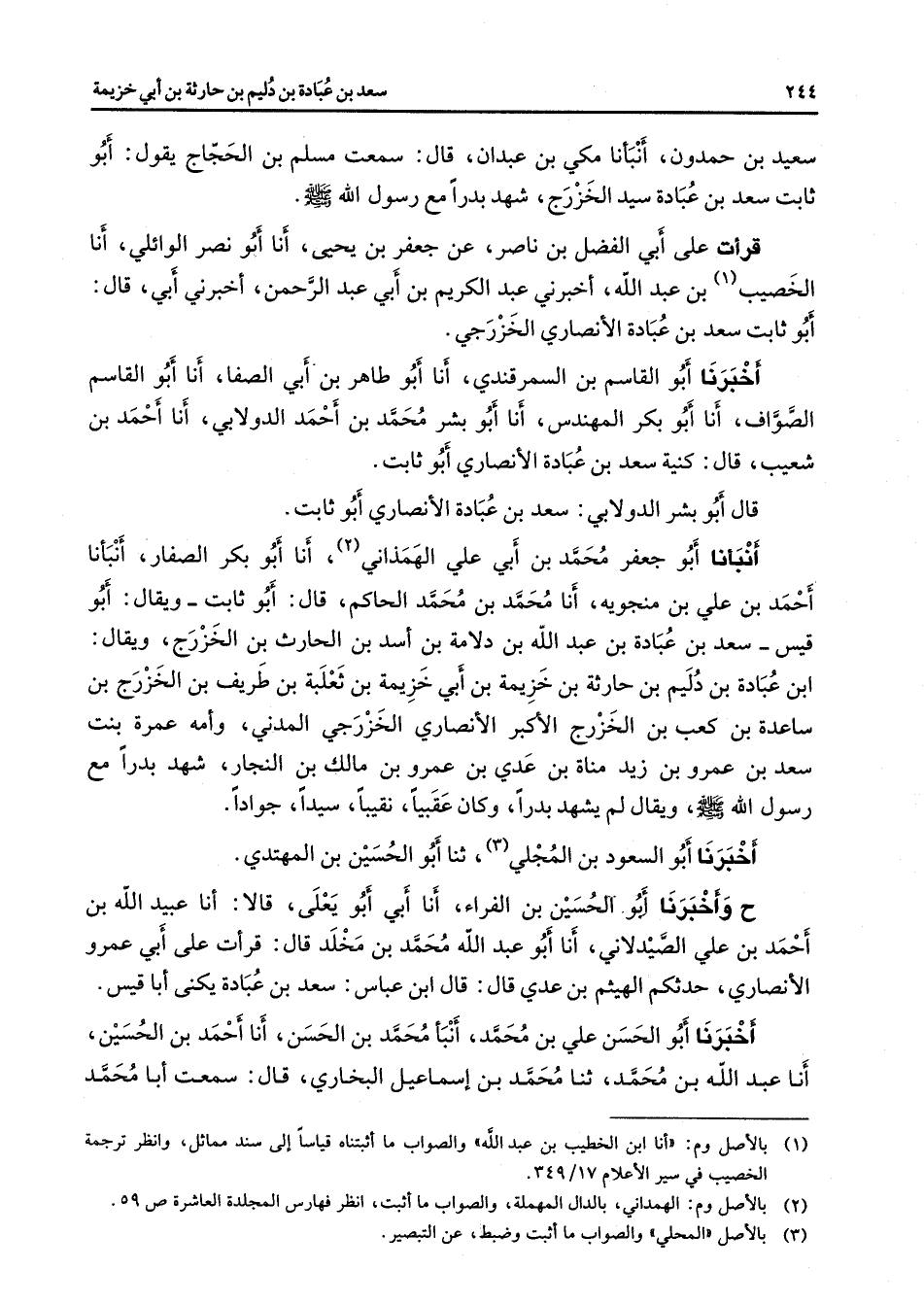 سعيد بن حمدون أنبانا مكي بن عبدان قال سمعت مسلم بن الحجاج يقول أبو ثابت سعد بن عبادة سيد الخزرج شهد بدرا مع رسول الله (صلى الله عليه وسلم) قرأت على أبي الفضل بن ناصر عن جعفر بن يحيى أنا أبو نصر الوائلي أنا الخصيب (1) بن عبد الله أخبرني عبد الكريم بن أبي عبد الرحمن أخبرني أبي قال أبو ثابت سعد بن عبادة الأنصاري الخزرجي أخبرنا أبو القاسم بن السمرقندي أنا أبو طاهر بن أبي الصفا أنا أبو القاسم الصواف أنا أبو بكر المهندس أنا أبو بشر محمد بن أحمد الدولابي أنا أحمد بن شعيب قال كنية سعد بن عبادة الأنصاري أبو ثابت قال أبو بشر الدولابي سعد بن عبادة الأنصاري أبو ثابت أنبأنا أبو جعفر محمد بن أبي علي الهمذاني (2) أنا أبو بكر الصفار أنبأنا أحمد بن علي بن منجويه أنا محمد بن محمد الحاكم قال أبو ثابت ويقال أبو قيس سعد بن عبادة بن عبد الله بن دلامة بن أسد بن الحارث بن الخزرج ويقال ابن عبادة بن دليم بن حارثة بن خزيمة بن أبي خزيمة بن ثعلبة بن طريف بن الخزرج بن ساعدة بن كعب بن الخزرج الأكبر الأنصاري الخزرجي المدني وأمه عمرة بنت سعد بن عمرو بن زيد مناة بن عدي بن عمرو بن مالك بن النجار شهد بدرا مع رسول الله (صلى الله عليه وسلم) ويقال لم يشهد بدرا وكان عقبيا نقيبا سيدا جوادا أخبرنا أبو السعود بن المجلي (3) ثنا أبو الحسين بن المهتدى ح وأخبرنا أبو الحسين بن الفراء أنا أبي أبو يعلى قالا أنا عبيد الله بن أحمد بن علي الصيدلاني أنا أبو عبد الله محمد بن مخلد قال قرات على أبي عمرو الأنصاري حدثكم الهيثم بن عدي قال قال ابن عباس سعد بن عبادة يكنى أبا قيس أخبرنا أبو الحسن علي بن محمد أنبأ محمد بن الحسن أنا أحمد بن الحسين أنا عبد الله بن محمد ثنا محمد بن إسماعيل البخاري قال سمعت ابا محمد