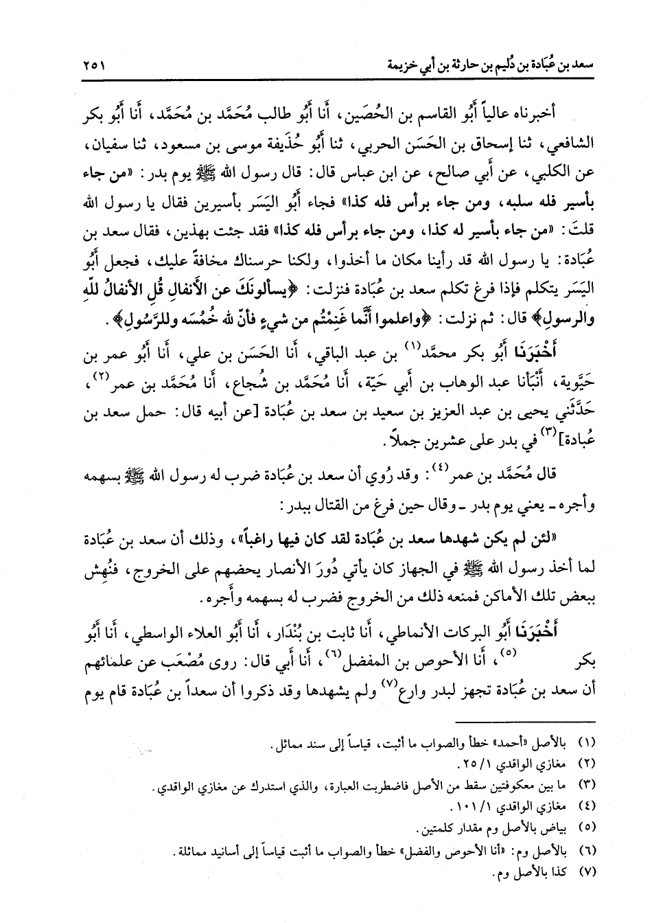 أخبرناه عاليا أبو القاسم بن الحصين أنا أبو طالب محمد بن محمد أنا أبو بكر الشافعي ثنا إسحاق بن الحسن الحربي ثنا أبو حذيفة موسى بن مسعود ثنا سفيان عن الكلبي عن أبي صالح عن ابن عباس قال قال رسول الله (صلى الله عليه وسلم) يوم بدر من جاء بأسير فله سلبه ومن جاء برأس فله كذا فجاء أبو اليسر بأسيرين فقال يا رسول الله قلت من جاء بأسير له كذا ومن جاء برأس فله كذا فقد جئت بهذين فقال سعد بن عبادة يا رسول الله قد رأينا مكان ما أخذوا ولكنا حرسناك مخافة عليك فجعل أبو اليسر يتكلم فإذا فرغ تكلم سعد بن عبادة فنزلت " يسألونك عن الأنفال قل الأنفال لله والرسول " قال ثم نزلت " واعلموا أنما غنمتم من شئ فإن لله خمسه وللرسول " أخبرنا أبو بكر محمد (1) بن عبد الباقي أنا الحسن بن علي أنا أبو عمر بن حيوية أنبأنا عبد الوهاب بنأبي حية أنا محمد بن شجاع أنا محمد بن عمر (2) حدثني يحيى بن عبد العزيز بن سعيد بن سعد بن عبادة عن أبيه قال حمل سعد بن عبادة (3) في بدر على عشرين جملا قال محمد بن عمر (4) وقد روي أن سعد بن عبادة ضرب له رسول الله (صلى الله عليه وسلم) بسهمه وأجره يعني يوم بدر وقال حين فرغ من القتال ببدر لئن لم يكن شهدها سعد بن عبادة لقد كان فيها راغبا وذلك أن سعد بن عبادة لما أخذ رسول الله (صلى الله عليه وسلم) في الجهاز كان يأتي دور الأنصار يحضهم على الخروج فنهش ببعض تلك الأماكن فمنعه ذلك من الخروج فضرب له بسهمه وأجره أخبرنا أبو البركات الأنماطي أنا ثابت بن بندار أنا أبو العلاء الواسطي أنا أبو بكر (5) أنا الأحوص بن المفضل (6) أنا أبي قال روى مصعب عن علمائهم أن سعد بن عبادة تجهز لبدر وارع (7) ولم يشهدها وقد ذكروا أن سعدا بن عبادة قام يوم
