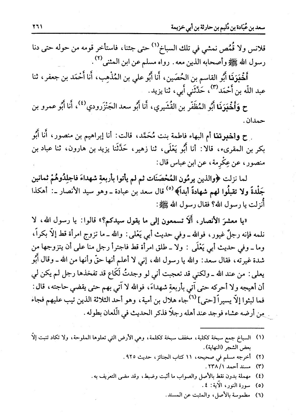 قلانس ولا قمص نمشي في تلك السباخ (1) حتى جئنا فاستأخر قومه من حوله حتى دنا رسول الله (صلى الله عليه وسلم) وأصحابه الذين معهح - رواه مسلم - عن ابن المثنى (2) أخبرنا أبو القاسم بن الحصين أنا أبو علي بن المذهب أنا أحمد بن جعفر ثنا عبد الله بن أحمد حدثني أبي ثنا يزيد ح وأخبرنا أبو المظفر بن القشيري أنا أبو سعد الجنزرودي (4) أنا أبو عمر بن حمدان ح وأخبرتنا أم البهاء فاطمة بنت محمد قالت أنا إبراهيم بن منصور أنا أبو بكر بن المقرئ قالا أنا أبو يعلى ثنا زهير حدثنا يزيد بن هارون ثنا عباد بن منصور عن عكرمة عن ابن عباس قال لما نزلت " والذين يرمون المحصنات ثم لم يأتوا بأربعة شهداء فاجلدوهم ثمانين جلدة ولا تقبلوا لهم شهادة أبدا " (5) قال سعد بن عبادة وهو سيد الأنصار أهكذا أنزلت يا رسول الله فقال رسول الله (صلى الله عليه وسلم) يا معشر الأنصار ألا تسمعون إلى ما يقول سيدكم قالوا يا رسول الله لا نلمه فإنه رجل غيور فوالله وفي حديث أبي يعلى والله ما تزوج امرأة قط إلا بكرا وما وفي حديث أبي يعلى ولا طلق امرأة قط فاجترأ رجل منا على أن يتزوجها من شدة غيرته فقال سعد والله يا رسول الله إني لا أعلم أنها حق وأنها من الله وقال أبو يعلى من عند الله ولكني قد تعجبت أني لو وجدت لكاع قد تفخذها رجل لم يكن لي أن أهيجه ولا أحركه حتى آتي بأربعة شهداء فوالله لا آتي بهم حتى يقضي حاجته قال فما لبثوا إلا يسيرا حتى جاء هلال بن أمية وهو أحد الثلاثة الذين تيب عليهم فجاء من أرضه عشاء فوجد عند أهله رجلا فذكر الحديث في اللعان بطوله