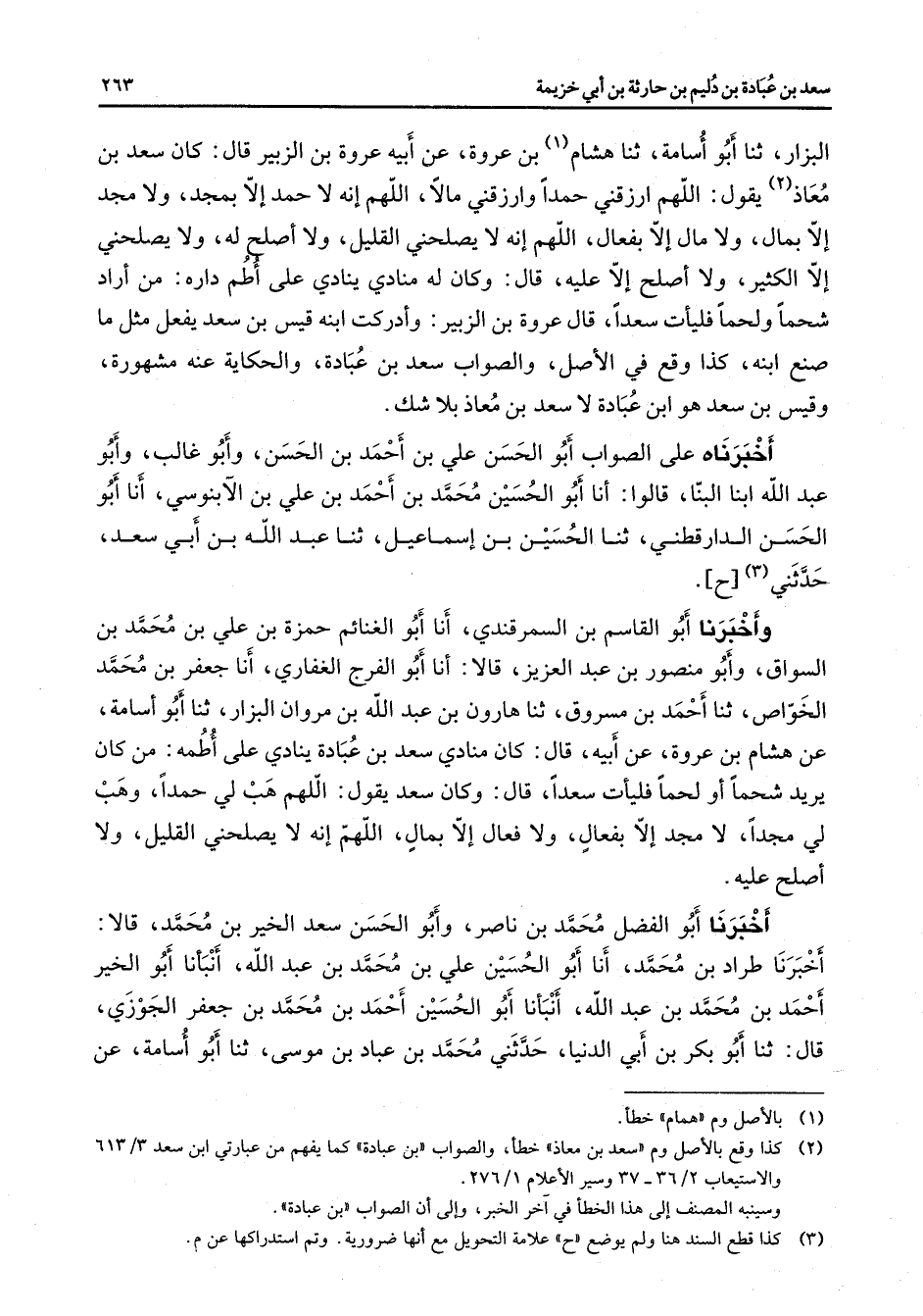 البزار ثنا أبو أسامة ثنا هشام (1) بن عروة عن أبيه بن الزبير قال كان سعد بن معاذ (2) يقول اللهم ارزقني حمدا وارزقني مالا اللهم إنه لا حمد إلا بمجد ولا مجد إلا بمال ولا مال إلا بفعال اللهم إنه لا يصلحني القليل ولا أصلح له ولا يصلحني إلا الكثير ولا أصلح إلا عليه قال وكان له منادي ينادي على أطم داره من أراد شحما ولحما فليأت سعدا قال عروة بن الزبير وأدركت ابنه قيس بن سعد يفعل مثل ما صنع ابنه كذا وقع في الأصل والصواب سعد بن عبادة والحكاية عنه مشهورة وقيس بن سعد هو ابن عبادة لا سعد بن معاذ بلا شك أخبرناه على الصواب أبو الحسن علي بن أحمد بن الحسن وأبو غالب وأبو عبد الله ابنا البنا قالوا أنا أبو الحسين محمد بن أحمد بن علي بن الآبنوسي أنا أبو الحسن الدارقطني ثنا الحسين بن إسماعيل ثنا عبد الله بن أبي سعد حدثني (3) [ح] وأخبرنا أبو القاسم بن السمرقندي أنا أبو الغنائم حمزة بن علي بن محمد بن السواق وأبو منصور بن عبد العزيز قالا أنا أبو الفرج الغفاري أنا جعفر بن محمد الخواص ثنا أحمد بن مسروق ثنا هارون بن عبد الله بن مروان البزار ثنا أبو أسامة عن هشام بن عروة عن أبيه قال كان منادي سعد بن عبادة ينادي على أطمه من كان يريد شحما أو لحما فليأت سعدا قال وكان سعد يقول اللهم هب لي حمدا وهب لي مجدا لا مجد إلا بفعال ولا فعال إلا بمال اللهم إنه لا يصلحني القليل ولا أصلح عليه أخبرنا أبو الفضل محمد بن ناصر وأبو الحسن سعد الخير بن محمد قالا أخبرنا طراد بن محمد أنا أبو الحسين علي بن محمد بن عبد الله أنبأنا أبو الخير أحمد بن محمد بن عبد الله أنبأنا أبو الحسين أحمد بن محمد بن جعفر الجوزي قال ثنا أبو بكر بنأبي الدنيا حدثني محمد بن عباد بن موسى ثنا أبو أسامة عن