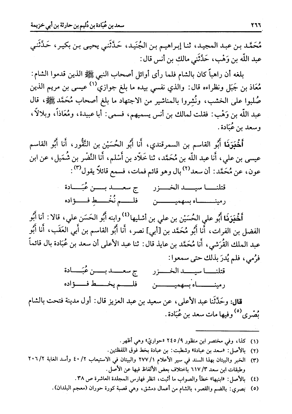 محمد بن عبد المجيد ثنا إبراهيم بن الجنيد حدثني يحيى بن بكير حدثني عبد الله بن وهب حدثني مالك بن أنس قال بلغه أن راهبا كان بالشام فلما رأى أوائل أصحاب النبي (صلى الله عليه وسلم) الذين قدموا الشام معاذ بن جبل ونظراءه قال والذي نفسي بيده ما بلغ جوازي (1) عيسى بن مريم الذين صلبوا على الخشب ونشروا بالمناشير من الاجتهاد ما بلغ أصحاب محمد (صلى الله عليه وسلم) قال عبد الله بن وهب فقلت لمالك بنأنس يسميهم فسمى أبا عبيدة ومعاذا وبلالا وسعد بن عبادة أخبرنا أبو القاسم بن السمرقندي أنا أبو الحسين بن النقور أنا أبو القاسم عيسى بن علي أنا عبد الله بن محمد ثنا خلاد بنأسلم أنا النضر بن شميل عن ابن عون عن محمد أن سعد (2) بال وهو قائم فمات فسمع قائلا يقول (3) * قتلنا سيد الخزر * ج سعد بن عبادة رميناه بسهمين * فلم نخط فؤاده * أخبرنا أبو علي الحسين بن علي بن أشليها (4) وابنه أبو الحسن علي قالا أنا أبو الفضل بن الفرات أنا أبو محمد بن أبي نصر أنا أبو القاسم بن أبي العقب أنا أبو عبد الملك القرشي أنا محمد بن عايذ قال ثنا عبد الأعلى أن سعد بن عبادة بال قائما فرمي فلم يدر بذلك حتى سمعوا * قتلنا سيد الخزر * ج سعد بن عبادة رميناه بسهمين * فلم يخط فؤاده * قال وحدثنا عبد الأعلى عن سعيد بن عبد العزيز قال أول مدينة فتحت بالشام بصرى (5) وفيها مات سعد بن عبادة