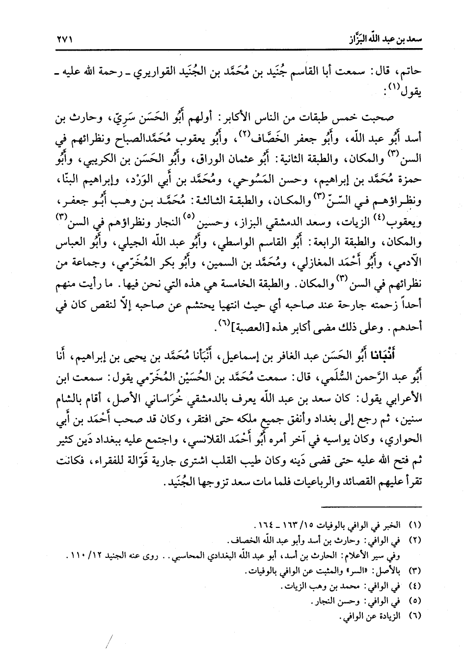 حاتم قال سمعت أبا القاسم جنيد بن محمد بن الجنيد القواريري رحمة الله عليه يقول (1) صحبت خمس طبقات من الناس الأكابر أولهم أبو الحسن سري وحارث بن أسد أبو عبد الله وأبو جعفر الخصاف (2) وأبو يعقوب محمد الصباح ونظرائهم في السن (3) والمكان والطبقة الثانية أبو عثمان الوراق وأبو الحسن بن الكريبي وأبو حمزة محمد بن إبراهيم وحسن المسوحي ومحمد بن أبي الورد وإبراهيم البنا ونظراؤهم في السن (3) والمكان والطبقة الثالثة محمد بن وهب أبو جعفر ويعقوب (4) الزيات وسعد الدمشقي البزاز وحسين (5) النجار ونظراؤهم في السن (3) والمكان والطبقة الرابعة أبو القاسم الواسطي وأبو عبد الله الجيلي وأبو العباس الآدمي وأبو أحمد المغازلي ومحمد بن السمين وأبو بكر المخرمي وجماعة من نظرائهم في السن (3) والمكان والطبقة الخامسة هي هذه التي نحن فيها ما رأيت منهم أحدا زحمته جارحة عند صاحبه أي حيث انتهيا يحتشم عن صاحبه إلا لنقص كان في أحدهم وعلى ذلك مضى أكابر هذه العصبة (6) أنبأنا أبو الحسن عبد الغافر بن إسماعيل أنبأنا محمد بن يحيى بن إبراهيم أنا أبو عبد الرحمن السلمي قال سمعت محمد بن الحسين المخرمي يقول سمعت ابن الأعرابي يقول كان سعد بن عبد الله يعرف بالدمشقي خراساني الأصل أقام بالشام سنين ثم رجع إلى بغداد وأنفق جميع ملكه حتى افتقر وكان قد صحب أحمد بن أبي الحواري وكان يواسيه في آخر أمره أبو احمد القلانسي واجتمع عليه ببغداد دين كثير ثم فتح الله عليه حتى قضى دينه وكان طيب القلب اشترى جارية قوالة للفقراء فكانت تقرأ عليهم القصائد والرباعيات فلما مات سعد تزوجها الجنيد