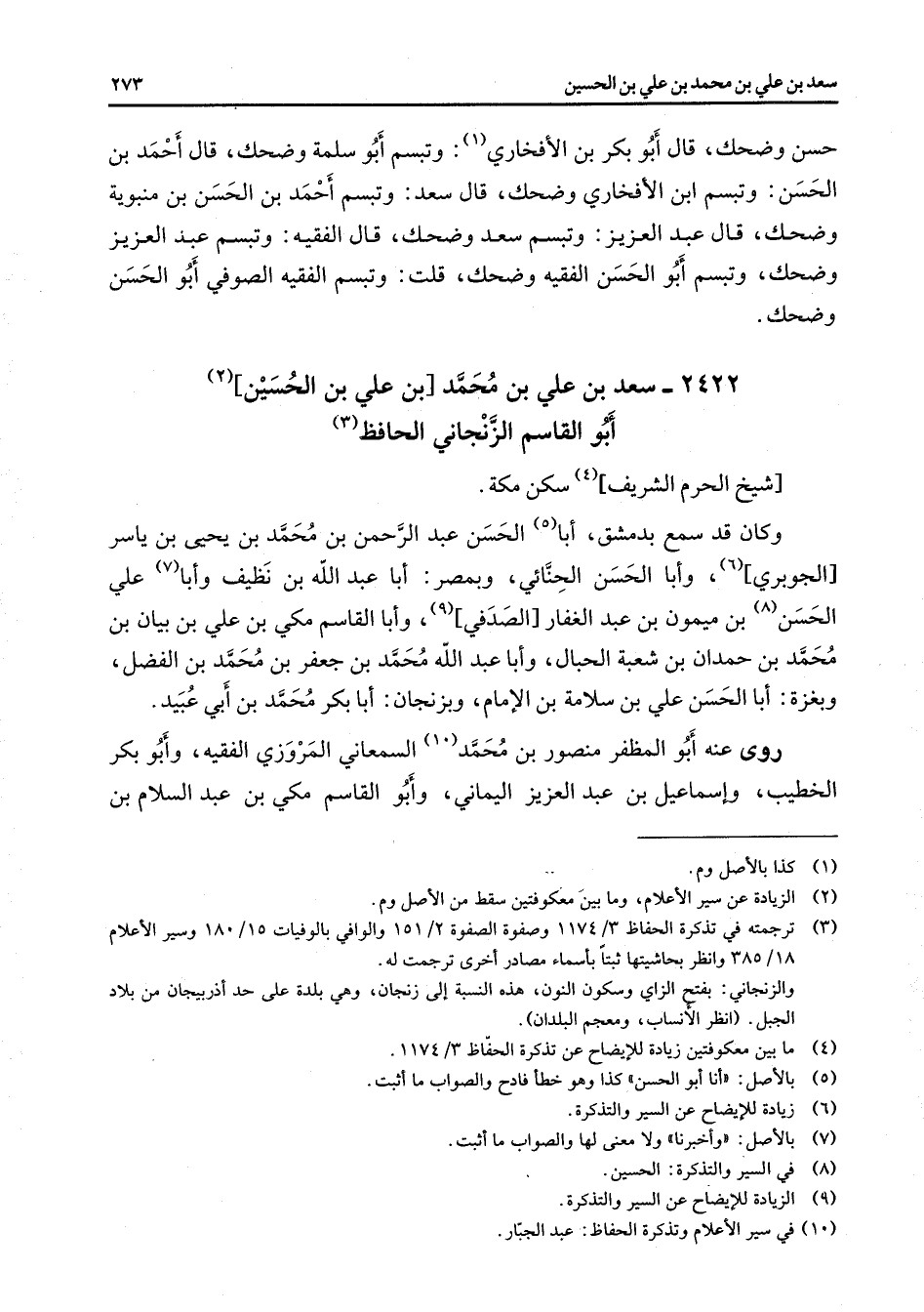 2422 - سعد بن علي بن محمد بن علي بن الحسين (2) أبو القاسم الزنجاني الحافظ (3) شيخ الحرم الشريف (4) سكن مكة وكان قد سمع بدمشق أبا (5) الحسن عبد الرحمن بن محمد بن يحيى بن ياسر الجوبري (6) وأبا الحسن الحنائي وبمصر أبا عبد الله بن نظيف وأبا (7) علي الحسن (8) بن ميمون بن عبد الغفار الصدفي (9) وأبا القاسم مكي بن علي بن بيان بن محمد بن حمدان بن شعبة الحبال وأبا عبد الله محمد بن جعفر بن محمد بن الفضل وبغزة أبا الحسن علي بن سلامة بن الإمام وبزنجان أبا بكر محمد بن أبي عبيد روى عنه أبو المظفر منصور بن محمد (10) السمعاني المروزي الفقيه وأبو بكر الخطيب وإسماعيل بن عبد العزيز اليماني وأبو القاسم مكي بن عبد السلام بن