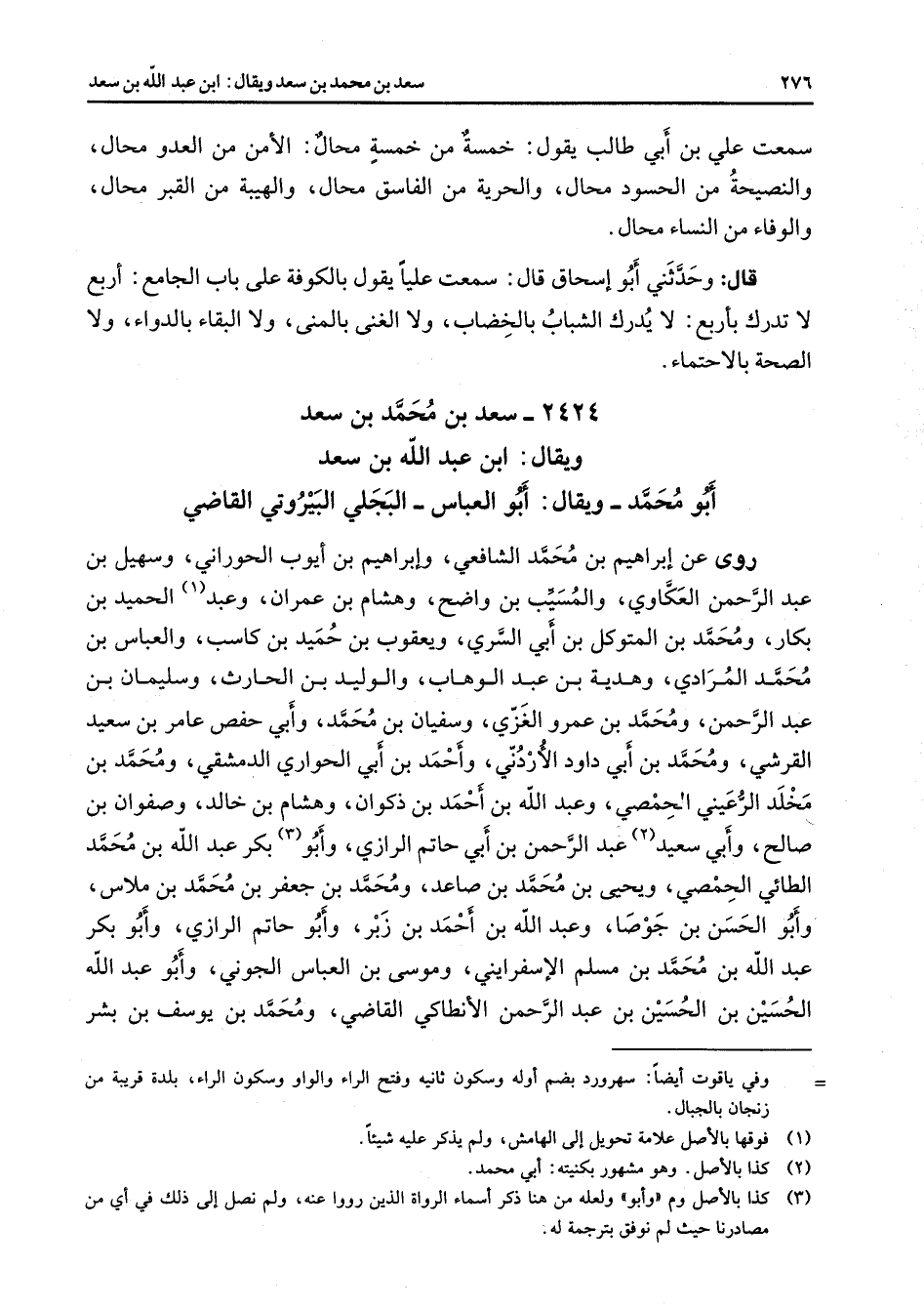 2424 - سعد بن محمد بن سعد ويقال ابن عبد الله بن سعد أبو محمد ويقال أبو العباس البجلي البيروتي القاضي روى عن إبراهيم بن محمد الشافعي وإبراهيم بن أيوب الحوراني وسهيل بن عبد الرحمن العكاوي والمسيب بن واضح وهشام بن عمران وعبد (1) الحميد بن بكار ومحمد بن المتوكل بن أبي السري ويعقوب بن حميد بن كاسب والعباس بن محمد المرادي وهدية بن عبد الوهاب والوليد بن الحارث وسليمان بن عبد الرحمن ومحمد بن عمرو الغزي وسفيان بن محمد وأبي حفص عامر بن سعيد القرشي ومحمد بن أبي داود الأردني وأحمد بن أبي الحواري الدمشقي ومحمد بن مخلد الرعيني الحمصي وعبد الله بن أحمد بن ذكوان وهشام بن خالد وصفوان بن صالح وأبي سعيد (2) عبد الرحمن بن أبي حاتم الرازي وأبو (3) بكر عبد الله بن محمد الطائي الحمصي ويحيى بن محمد بن صاعد ومحمد بنجعفر بن محمد بن ملاس وأبو الحسن بن جوصا وعبد الله بن أحمد بن زبر وأبو حاتم الرازي وأبو بكر عبد الله بن محمد بن مسلم الإسفرايني وموسى بن العباس الجوني وأبو عبد الله الحسين بن الحسين بن عبد الرحمن الأنطاكي القاضي ومحمد بن يوسف بن بشر
