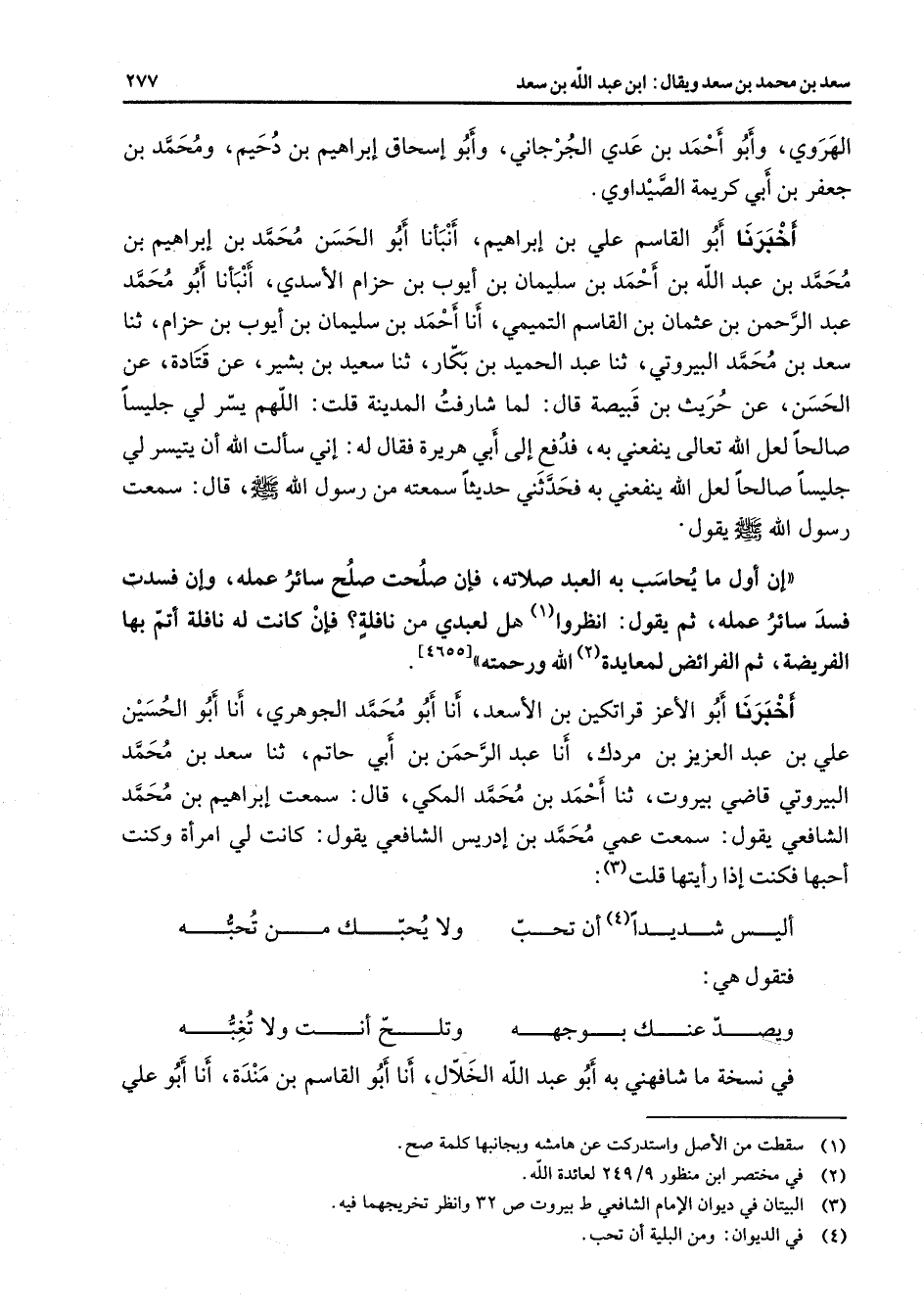 [4655] أخبرنا أبو الأعز قراتكين بن الأسعد أنا أبو محمد الجوهري أنا أبو الحسين علي بن عبد العزيز بن مردك أنا عبد الرحمن بن أبي حاتم ثنا سعد بن محمد البيروتي قاضي بيروت ثنا أحمد بن محمد الملكي قال سمعت إبراهيم بن محمد الشافعي يقول سمعت عمي محمد بن إدريس الشافعي يقول كانت لي امرأة وكنت أحبها فكنت إذا رأيتها قلت (3) * أليس شديدا أن تحب * ولا يحبك من تحبه * فتقول هي * ويصد عنك بوجهه * وتلح أنت ولا تغبه * في نسخة ما شافهني به أبو عبد الله الخلال أنا أبو القاسم بن مندة أنا أبو علي