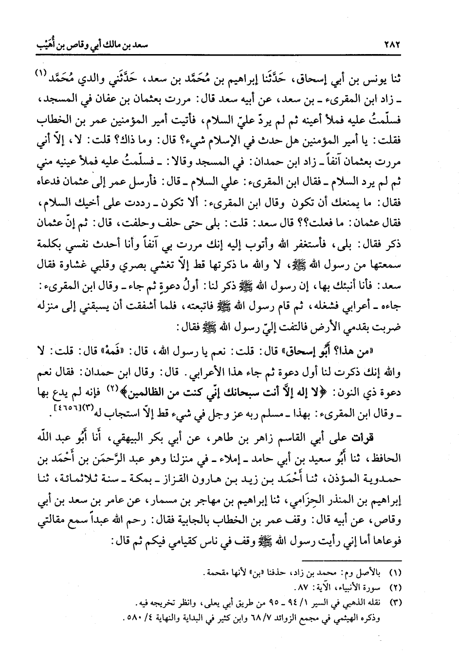 ثنا يونس بن أبي إسحاق حدثنا إبراهيم بن محمد بن سعد حدثني والدي محمد (1) زاد ابن المقرئ بن سعد عن أبيه سعد قال مررت بعثمان بن عفان في المسجد فسلمت عليه فملأ أعينه ثم لم يرد علي السلام فأتيت أمير المؤمنين عمر بن الخطاب فقلت يا أمير المؤمنين هل حدث في الإسلام شئ قال وما ذاك قلت لا إلا أني مررت بعثمان آنفا زاد ابن حمدان في المسجد وقالا فسلمت عليه فملأ عينيه مني ثم لم يرد السلام فقال ابن المقرئ علي السلام قال فأرسل عمر إلى عثمان فدعاه فقال ما يمنعك أن تكون وقال ابن المقرئ ألا تكون رددت على أخيك السلام فقال عثمان ما فعلت قال سعد قلت بلى حتى حلف وحلفت قال ثم إن عثمان ذكر فقال بلى فأستغفر الله وأتوب إليه إنك مررت بي آنفا وأنا أحدث نفسي بكلمة سمعتها من رسول الله (صلى الله عليه وسلم) لا والله ما ذكرتها قط إلا تغشى بصري وقلبي غشاوة فقال سعد فأنا أنبئك بها إن رسول الله (صلى الله عليه وسلم) ذكر لنا أول دعوة ثم جاء وقال ابن المقرئ جاءه أعرابي فشغله ثم قام رسول الله (صلى الله عليه وسلم) فاتبعته فلما أشفقت أن يسبقني إلى منزله ضربت بقدمي الأرض فالتفت إلي رسول الله (صلى الله عليه وسلم) فقال من هذا أبو اسحاق قال قلت نعم يا رسول الله قال فمه قال قلت لا والله إنك ذكرت لنا أول دعوة ثم جاء هذا الأعرابي قال وقال ابن حمدان فقال نعم دعوة ذي النون " لا إله إلا أنت سبحانك إني كنت من الظالمين " (2) فإنه لم يدع بها وقال ابن المقرئ بهذا مسلم ربه عز وجل في شئ قط إلا استجاب له (3) (4656) قرأت على أبي القاسم زاهر بن طاهر عن أبي بكر البيهقي أنا أبو عبد الله الحافظ ثنا أبو سعيد بن أبي حامد إملاء في منزلنا وهو عبد الرحمن بن أحمد بن حمدوية المؤذن ثنا أحمد بن زيد بن هارون القزاز بمكة سنة ثلاثمائة ثنا إبراهيم بن المنذر الحزامي ثنا إبراهيم بن مهاجر بن مسمار عن عامر بن سعد بن أبي وقاص عن أبيه قال وقف عمر بن الخطاب بالجابية فقال رحم الله عبدا سمع مقالتي فوعاها أما إني رأيت رسول الله (صلى الله عليه وسلم) وقف في ناس كقيامي فيكم ثم قال