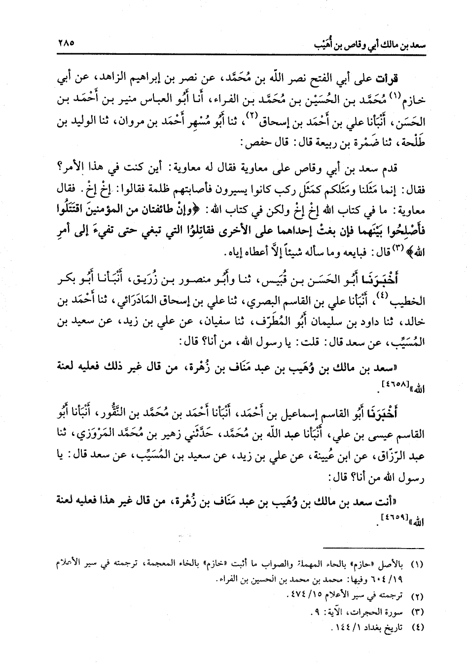 قرأت على أبي الفتح نصرالله بن محمد عن نصر بن إبراهيم الزاهد عن أبي خازم (1) محمد بن الحسين بن محمد بن الفراء أنا أبو العباس منير بن أحمد بن الحسن أنبأنا علي بن أحمد بن إسحاق (2) ثنا أبو مسهر أحمد بن مروان ثنا الوليد بن طلحة ثنا ضمرة بن ربيعة قال قال حفص قدم سعد بن أبي وقاص على معاوية فقال له معاوية أين كنت في هذا الأمر فقال إنما مثلنا ومثلكم كمثل ركب كانوا يسيرون فأصابتهم ظلمة فقالوا إخ إخ فقال معاوية ما في كتاب الله إخ إخ ولكن في كتاب الله " وإن طائفتان من المؤمنين اقتتلوا فأصلحوا بينهما فإن بغت إحداهما الأخرى فقاتلوا التي تبغي حتى تفئ إلى أمر الله " (3) قال فبايعه وما سأله شيئا إلا أعطاه إياه أخبرنا أبو الحسن بن قبيس ثنا وأبو منصور بن زريق أنبأنا أبو بكر الخطيب (4) أنبأنا علي بن القاسم البصري ثنا علي بن إسحاق المادرائي ثنا أحمد بن خالد ثنا داود بن سليمان أبو المطرف ثنا سفيان عن علي بن زيد عن سعيد بن المسيب عن سعد قال قلت يا رسول الله من انا قال سعد بن مالك بن وهيب بن عبد مناف بن زهرة من قال غير ذلك فعليه لعنة الله (4658) أخبرنا أبو القاسم إسماعيل بن أحمد أنبأنا أحمد بن محمد بن النقور أنبأنا أبو القاسم عيسى بن علي أنبأنا عبد الله بن محمد حدثني زهير بن محمد المروزي ثنا عبد الرزاق عن ابن عيينة عن علي بن زيد عن سعيد بن المسيب عن سعد قال يا رسول الله من أنا قال أنت سعد بن مالك بن وهيب بن عبد مناف بن زهرة من قال غير هذا فعليه لعنة الله (4659)