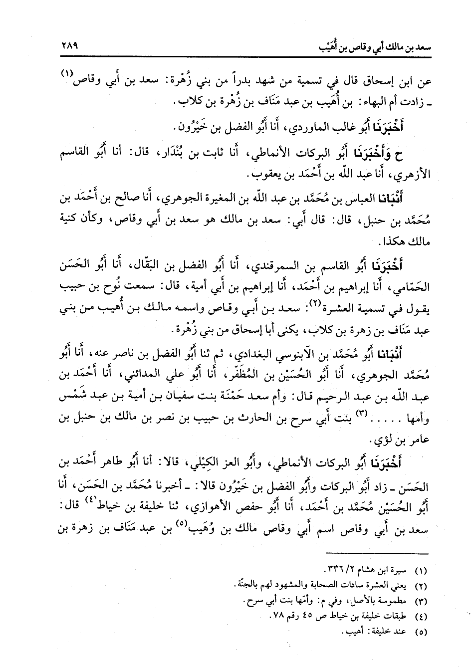عن ابن إسحاق قال في تسمية من شهد بدرا من بني زهرة سعد بن أبي وقاص (1) زادت أم البهاء بن اهيب بن عبد مناف بن زهرة بن كلاب أخبرنا أبو غالب الماوردي أنا أبو الفضل بن خيرون ح وأخبرنا أبو البركات الأنماطي أنا ثابت بن بندار قال أنا أبو القاسم الأزهري أنا عبد الله بن أحمد بن يعقوب أنبأنا العباس بن محمد بن عبد الله بن المغيرة الجوهري أنا صالح بن أحمد بن محمد بن حنبل قال قال أبي سعد بن مالك هو سعد بن أبي وقاص وكأن كنية مالك هكذا أخبرنا أبو القاسم بن السمرقندي أنا أبو الفضل بن البقال أنا أبو الحسن الحمامي أنا إبراهيم بنأحمد أنا إبراهيم بنأبي أمية قال سمعت نوح بن حبيب يقول في تسمية العشرة (2) سعد بن أبي وقاص واسمه مالك بن أهيب من بني عبد مناف بن زهرة بن كلاب يكنى أبا إسحاق من بني زهرة أنبأنا أبو محمد بن الآبنوسي البغدادي ثم ثنا أبو الفضل بن ناصر عنه أنا أبو محمد الجوهري أنا أبو الحسين بن المظفر أنا أبو علي المدائني أنا أحمد بن عبد الله بن عبد الرحيم قال وأم سعد حمنة بنت سفيان بنأمية بن عبد شمس وأمها (3) بنت أبي سرح بن الحارث بن حبيب بن نصر بن مالك بن حنبل بن عامر بن لؤي أخبرنا أبو البركات الأنماطي وأبو العز الكيلي قالا أنا أبو طاهر أحمد بن الحسن زاد أبو البركات وأبو الفضل بن خيرون قالا أخبرنا محمد بن الحسن أنا أبو الحسين محمد بن أحمد أنا أبو حقص الأهوازي ثنا خليفة بن خياط (4) قال سعد بن أبي وقاص اسم أبي وقاص مالك بن وهيب (5) بن عبد مناف بن زهرة بن