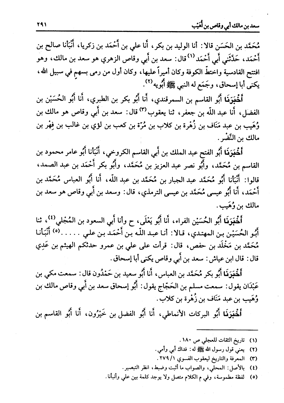 محمد بن الحسن قالا أنا الوليد بن بكر أنا علي بن أحمد بن زكريا أنبأنا صالح بن أحمد حدثني أبي أحمد (1) قال سعد بن أبي وقاص الزهري هو سعد بن مالك وهو افتتح القادسية واختط الكوفة وكان أميرا عليها وكان أول من رمى بسهم في سبيل الله يكنى أبا إسحاق وجمع له النبي (صلى الله عليه وسلم) أبويه (2) أخبرنا أبو القاسم بن السمرقندي أنا أبو بكر بن الطبري أنا أبو الحسين بن الفضل أنا عبد الله بن جعفر ثنا يعقوب (3) قال سعد بن أبي وقاص هو مالك بن وهيب بن عبد مناف بن زهرة بن كلاب بن مرة بن كعب بن لؤي بن غالب بن فهر بن مالك بن النضر أخبرنا أبو الفتح عبد الملك بنأبي القاسم الكروخي أنبأنا أبو عامر محمود بن القاسم بن محمد وأبو نصر عبد العزيز بن محمد وأبو بكر أحمد بن عبد الصمد قالوا أنبأنا أبو محمد عبد الجبار بن محمد بن عبد الله أنا أبو العباس محمد بن أحمد أنا أبو عيسى محمد بن عيسى الترمذي قال وسعد بنأبي وقاص هو سعد بن مالك بن وهيب أخبرنا أبو الحسين الفراء أنا أبو يعلى ح وأنا أبي السعود بن المجلي (4) ثنا أبو الحسين بن المهتدي قالا أنا عبد الله بن أحمد بن علي (5) أنبأنا محمد بن مخلد بن حفص قال قرأت على علي بن عمرو حدثكم الهيثم بن عدي قال قال ابن عياش سعد بنأبي وقاص يكنى أبا إسحاق أخبرنا أبو بكر محمد بن العباس أنا أبو سعيد بن حمدون قال سمعت مكي بن عبدان يقول سمعت مسلم بن الحجاج يقول أبو إسحاق سعد بن أبي وقاص مالك بن وهيب بن عبد مناف بن زهرة بن كلاب أخبرنا أبو البركات الأنماطي أنا أبو الفضل بن خيرون أنا أبو القاسم بن