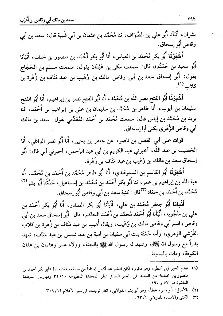 بشران أنبأنا أبو علي بن الصواف ثنا محمد بن عثمان بن أبي شيبة قال سعد بن أبي وقاص أبو إسحاق أخبرنا أبو بكر محمد بن العباس أنا أبو بكر أحمد بن منصور بن خلف أنبأنا أبو سعيد بن حمدون قال سمعت مكي بن عبدان يقول سمعت مسلم بن الحجاج يقول أبو إسحاق سعد بن أبي وقاص مالك بن وهيب بن عبد مناف بن زهرة بن كلاب (1) أخبرنا أبو الفتح نصر الله بن محمد أنا أبو الفتح نصر بن إبراهيم أنا أبو الفتح سليمان بن أيوب أنا طاهر بن محمد بن سليمان بن علي بن إبراهيم بن أحمد ثنا يزيد بن محمد بنإياس قال سمعت محمد بنأحمد المقدمي يقول سعد بن مالك أبي وقاص الزهري يكنى أبا إسحاق قرأت على أبي الفضل بن ناصر عن جعفر بن يحيى أنا أبو نصر الوائلي أنا الخصيب بن عبد الله أخبرني عبد الكريم بن أبي عبد الرحمن أخبرني أبي قال أبو إسحاق سعد بن مالك بن وهيب بن عبد مناف بن زهرة أخبرنا أبو القاسم بن السمرقندي أنا أبو طاهر محمد بن أحمد بن محمد أنا هبة الله بن إبراهيم بن عمر ثنا أبو بكر أحمد بن محمد بن إسماعيل حدثنا أبو بشر (2) محمد بن أحمد بن حماد (3) قال كنية سعد بن أبي وقاص أبو إسحاق أنبأنا أبو جعفر محمد بن علي أنبأنا أبو بكر لصفار أنا أبو بكر أحمد بن علي بن منجويه أنبأنا أبو أحمد محمد بن أحمد الحاكم قال أبو إسحاق سعد بن أبي وقاص واسم أبي وقاص مالك بن وهيب ويقال أهيب بن عبد مناف بن زهرة بن كلاب القرشي الزهري وأمه حمنة بنت أبي سفيان بنأمية بن عبد شمس بن عبد مناف شهد بدرا مع رسول الله (صلى الله عليه وسلم) وشهد له رسول الله (صلى الله عليه وسلم) بالجنة وولاه عمر وعثمان بن عفان الكوفة ومات بالمدينة