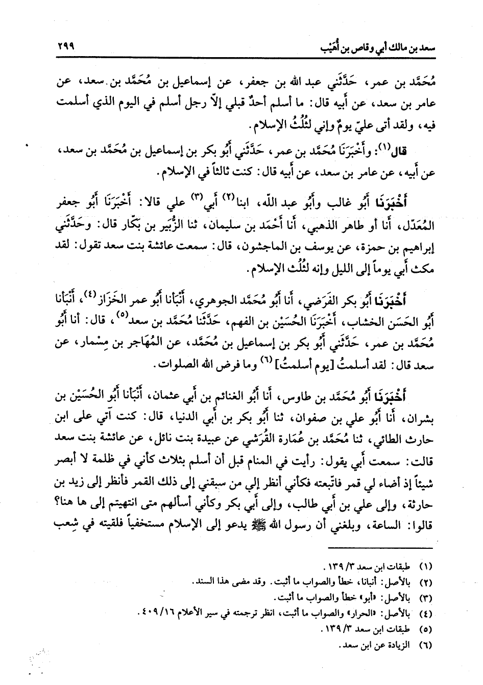 محمد بن عمر حدثني عبد الله بن جعفر عن إسماعيل بن محمد بن سعد عن عامر بن سعد عن أبيه قال ما أسلم أحد قبلي إلا رجل أسلم في اليوم الذي أسلمت فيه ولقد أتى علي يوم وإني لثلث الإسلام قال (1) وأخبرنا محمد بن عمر حدثني أبو بكر بن إسماعيل بن محمد بن سعد عن أبيه عن عامر بن سعد عنأبيه قال كنت ثالثا في الإسلام أخبرنا أبو غالب وأبو عبد الله ابنا (2) أبي (3) علي قالا أخبرنا أبو جعفر المعدل أنا أبو طاهر الذهبي أنا أحمد بن سليمان ثنا الزبير بن بكار قال وحدثني إبراهيم بن حمزة عن يوسف بن الماجشون قال سمعت عائشة بنت سعد تقول لقد مكث أبي يوما إلى الليل وإنه لثلث الإسلام أخبرنا أبو بكر الفرضي أنا أبو محمد الجوهري أنبأنا أبو عمر الخزاز أنبأنا أبو الحسن الخشاب أخبرنا الحسين بن الفهم حدثنا محمد بن سعد (5) قال أنا أبو بكر محمد بن عمر حدثني أبو بكر بن إسماعيل بن محمد عن المهاجر بن مسمار عن سعد قال لقد أسلمت يوم أسلمت (6) وما فرض الله الصلوات أخبرنا أبو محمد بن طاوس أنا أبو الغنائم بنأبي عثمان أنبأنا أبو الحسين بن بشران أنا أبو علي بن صفوان ثنا أبو بكر بن أبي الدنيا قال كنت آتي على ابن حارث الطائي ثنا محمد بن عمارة القرشي عن عبيدة بنت نائل عن عائشة بنت سعد قالت سمعت أبي يقول رأيت في المنام قبل أن أسلم بثلاث كأني في ظلمة لا أبصر شيئا إذ أضاء لي قمر فاتبعته فكأني أنظر إلى من سبقني إلى ذلك القمر فأنظر إلى زيد بن حارثة وإلى علي بن أبي طالب وإلى أبي بكر وكأني أسألهم متى انتهيتم إلى ها هنا قالوا الساعة وبلغني أن رسول الله (صلى الله عليه وسلم) يدعو إلى الإسلام مستخفيا فلقيته في شعب