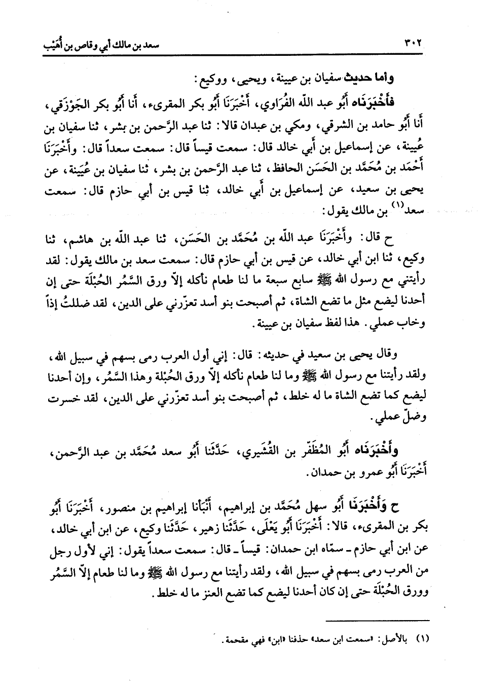 وأما حديث سفيان بن عيينة ويحيى ووكيع فأخبرناه أبو عبد الله الفراوي أخبرنا أبو بكر المقرئ أنا أبو بكر الجوزقي أنا أبو حامد بن الشرقي ومكي بن عبدان قالا ثنا عبد الرحمن بن بشر ثنا سفيان بن عيينة عن إسماعيل بنأبي خالد قال سمعت قيسا قال سمعت سعدا قال وأخبرنا أحمد بن محمد بن الحسن الحافظ ثنا عبد الرحمن بن بشر ثنا سفيان بن عيينة عن يحيى بن سعيد عن إسماعيل بنأبي خالد ثنا قيس بن أبي حازم قال سمعت سعد (1) بن مالك يقول ح قال وأخبرنا عبد الله بن محمد بن الحسن ثنا عبد الله بن هاشم ثنا وكيع ثنا ابن أبي خالد عن قيس بن أبي حازم قال سمعت سعد بن مالك يقول لقد رأيتني مع رسول الله (صلى الله عليه وسلم) سابع سبعة ما لنا طعام نأكله إلا ورق السمر الحبلة حتى إن أحدنا ليضع مثل ما تضع الشاة ثم أصبحت بنو أسد تعزرني على الدين لقد ضللت إذا وخاب عملي هذا لفظ سفيان بن عيينة وقال يحيى بن سعيد في حديثه قال إني أول العرب رمى بسهم في سبيل الله ولقد رأيتنا مع رسول الله (صلى الله عليه وسلم) وما لنا طعام نأكله إلا ورق الحبلة وهذا السمر وإن أحدنا ليضع كما تضع الشاة ما له خلط ثم أصبحت بنو أسد تعزرني على الدين لقد خسرت وضل عملي وأخبرناه أبو المظفر بن القشيري حدثنا أبو سعد محمد بن عبد الرحمن أخبرنا أبو عمرو بن حمدان ح وأخبرنا أبو سهل محمد بن إبراهيم أنبأنا إبراهيم بن منصور أخبرنا أبو بكر بن المقرئ قالا أخبرنا أبو يعلى حدثنا زهير حدثنا وكيع عن ابن أبي خالد عن ابن أبي حازم سماه ابن حمدان قيسا قال سمعت سعدا يقول إني لأول رجل من العرب رمى بسهم في سبيل الله ولقد رأيتنا مع رسول الله (صلى الله عليه وسلم) وما لنا طعام إلا السمر وورق الحبلة حتى إن كان أحدنا ليضع كما تضع العنز ما له خلط