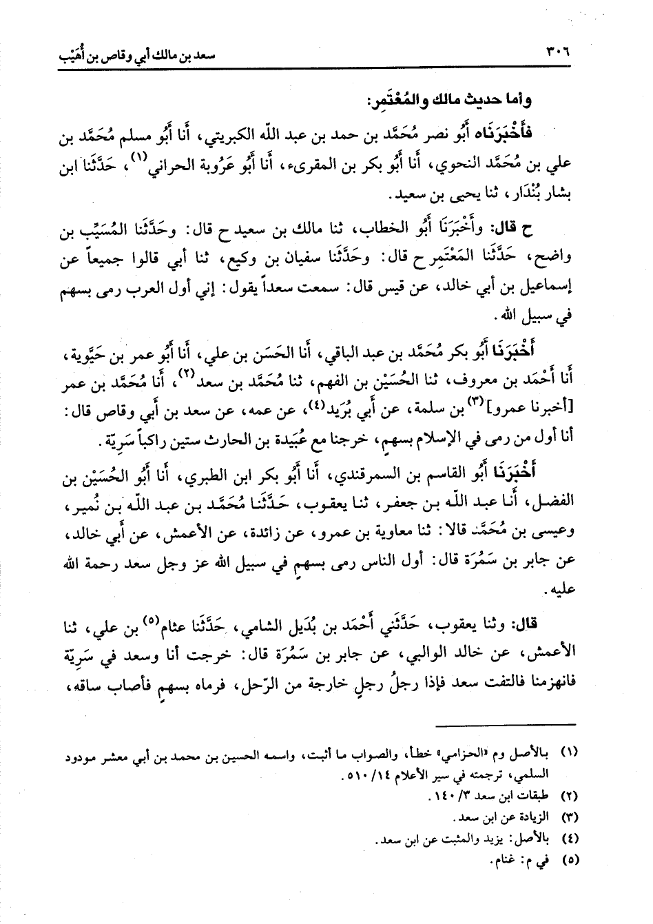وأما حديث مالك والمعتمر فأخبرناه أبو نصر محمد بن حمد بن عبد الله الكبريتي أنا أبو مسلم محمد بن علي بن محمد النحوي أنا أبو بكر بن المقرئ أنا أبو عروبة الحراني (1) حدثنا ابن بشار بندار ثنا يحيى بن سعيد ح قال وأخبرنا أبو الخطاب ثنا مالك بن سعيد ح قال وحدثنا المسيب بن واضح حدثنا المعتمر ح قال وحدثنا سفيان بن وكيع ثنا أبي قالوا جميعا عن إسماعيل بن أبي خالد عن قيس قال سمعت سعدا يقول إني أول العرب رمى بسهم في سبيل الله أخبرنا أبو بكر محمد بن عبد الباقي أنا الحسن بن علي أنا أبو عمر بن حيوية أنا أحمد بن معروف ثنا الحسين بن الفهم ثنا محمد بن سعد (2) أنا محمد بن عمر أخبرنا عمرو (3) بن سلمة عن أبي بريد (4) عن عمه عن سعد بن أبي وقاص قال أنا أول من رمى في الإسلام بسهم خرجنا مع عبيدة بن الحارث ستين راكبا سرية أخبرنا أبو القاسم بن السمرقندي أنا أبو بكر ابن الطبري أنا أبو الحسين بن الفضل أنا عبد الله بن جعفر ثنا يعقوب حدثنا محمد بن عبد الله بن نمير وعيسى بن محمد قالا ثنا معاوية بن عمرو عن زائدة عن الأعمش عن أبي خالد عن جابر بن سمرة قال أول الناس رمى بسهم في سبيل الله عز وجل سعد رحمة الله عليه قال وثنا يعقوب حدثني أحمد بن بديل الشامي حدثنا عثام (5) بن علي ثنا الأعمش عن خالد الوالبي عن جابر بن سمرة قال خرجت أنا وسعد في سرية فانهزمنا فالتفت سعد فإذا رجل رجل خارجة من الرحل فرماه بسهم فأصاب ساقه
