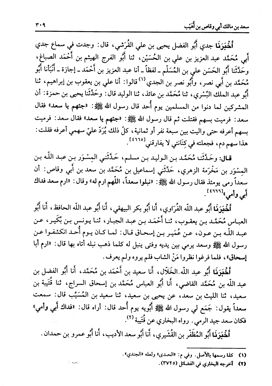 [4666] أخبرنا أبو عبد الله الفراوي أنا أبو بكر البيهقي أنا أبو عبد الله الحافظ أنا أبو العباس محمد بن يعقوب ثنا أحمد بن عبد الجبار ثنا يونس بن بكير عن عبد الله بن عون عن عمير بن إسحاق قال لما كان يوم أحد انكشفوا عن رسول الله (صلى الله عليه وسلم) وسعد يرمي بين يديه وفتى ينبل له كلما ذهب نبله أتاه بها قال ارم أبا إسحاق فلما فرغوا نظروا من الشاب فلم يروه ولم يعرف أخبرنا أبو عبد الله الخلال أنا سعيد بن أحمد بن محمد أنا أبو الفضل بن عبد الله بن محمد القاضي أنا أبو العباس محمد بن إسحاق السراج ثنا قتيبة بن سعيد ثنا الليث بن سعد عن يحيى بن سعيد ثنا سعيد بن المسيب قال سمعت سعدا يقول جمع لي رسول الله (صلى الله عليه وسلم) أبويه يوم أحد قال أراه قال فداك أبي وأمي فكان سعد جيد الرمي - رواه البخاري - عن قتيبة (2) أخبرنا أبو المظفر بن القشيري أنا أبو سعد الأديب أنا أبو عمرو بن حمدان