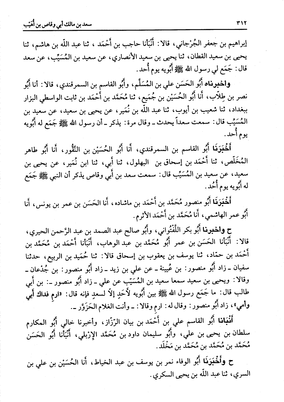 إبراهيم بن جعفر الجرجاني قالا أنبأنا حاجب بن أحمد ثنا عبد الله بن هاشم ثنا يحيى بن سعد القطان ثنا يحيى بن سعيد الأنصاري عن سعيد بن المسيب عن سعد قال جمع لي رسول الله (صلى الله عليه وسلم) أبويه يوم أحد وأخبرناه أبو الحسن علي بن المسلم وأبو القاسم بن السمرقندي قالا أنا أبو نصر بن طلاب أنا أبو الحسين بن جميع ثنا محمد بنأحمد بن ثابت الواسطي البزار ببغداد ثنا شعيب بن أيوب ثنا عبد الله بن نمير عن يحيى بن سعيد عن سعيد بن المسيب قال سمعت سعدا يحدث وقال مرة يذكر أن رسول الله (صلى الله عليه وسلم) جمع له أبويه يوم أحد أخبرنا أبو القاسم بن السمرقندي أنا أبو الحسين بن النقور أنا أبو طاهر المخلص ثنا أحمد بن إسحاق بن البهلول ثنا أبي ثنا ابن نمير عن يحيى بن سعيد عن سعيد بن المسيب قال سمعت سعد بن أبي وقاص يذكر أن النبي (صلى الله عليه وسلم) جمع له أبويه يوم أحد أخبرنا أبو منصور محمد بن أحمد بن ماشاده أنا الحسن بن عمر بن يونس أنا أبو عمر الهاشمي أنا محمد بن أحمد الأثرم ح وأخبرنا أبو بكر اللفتواني وأبو صالح عبد الصمد بن عبد الرحمن الحيري قالا أنبأنا الحسن بن عمر أبو محمد بن عبد الوهاب أنبأنا أحمد بن محمد بن أحمد بن حماد ثنا يوسف بن يعقوب بن إسحاق قالا ثنا حميد بن الربيع حدثنا سفيان زاد أبو منصور بن عيينة عن علي بن زيد زاد أبو منصور بن جدعان وقالا ويحيى بن سعيد سمعا سعيد بن المسيب عن علي زاد أبو منصور بن أبي طالب قال ما جمع رسول الله (صلى الله عليه وسلم) بين أبويه لأحد إلا لسعد فإنه قال ارم فداك أبي وأمي زاد أبو منصور وقال له ارم وقالا وأنت الغلام الحزور أنبأنا أبو القاسم علي بن أحمد بن بيان الرزاز وأخبرنا خالي أبو المكارم سلطان بن يحيى بن علي وأبو سليمان داود بن محمد الإربلي أنبأنا أبو الحسن محمد بن محمد بن محمد بن مخلد ح وأخبرنا أبو الوفاء نمر بن يوسف بن عبد الخياط أنا الحسين بن علي بن السري ثنا عبد الله بن يحيى السكري