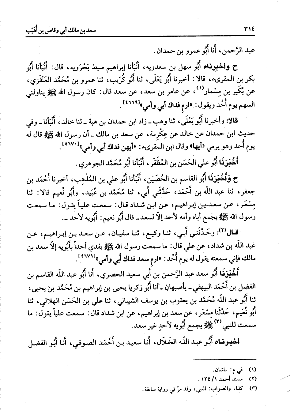 [4671] أخبرنا أبو سعد عبد الرحمن بن أبي سعيد الحصري أنا أبو عبد الله القاسم بن الفضل بن أحمد البيهقي بأصبهان أنا أبو زكريا يحيى بن إبراهيم بن محمد بن يحيى ثنا أبو عبد الله محمد بن يعقوب الشيباني ثنا علي بن الحسن الهلالي ثنا أبو نعيم حدثنا مسعر عن سعد بن إبرهيم عن ابن شداد قال سمعت عليا يقول ما سمعت للنبي (3) (صلى الله عليه وسلم) يجمع أبويه لأحد غير سعد أخبرناه أبو عبد الله الخلال أنا سعيد بن أحمد الصوفي أنا أبو الفضل